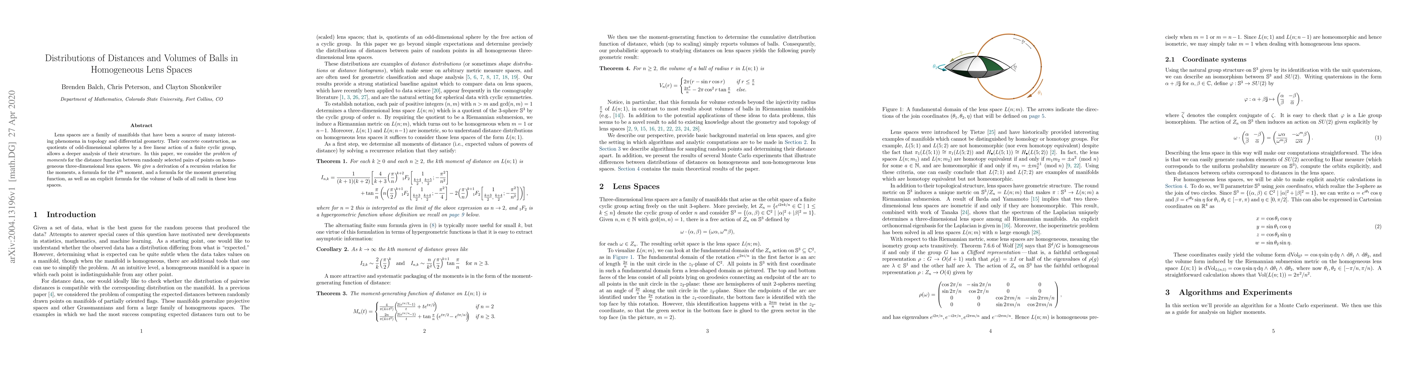 This paper derives recursion relations and explicit formulas for moments of distances between random points, and volumes of balls in homogeneous three-dimensional lens spaces, contributing to the understanding of these geometric structures.