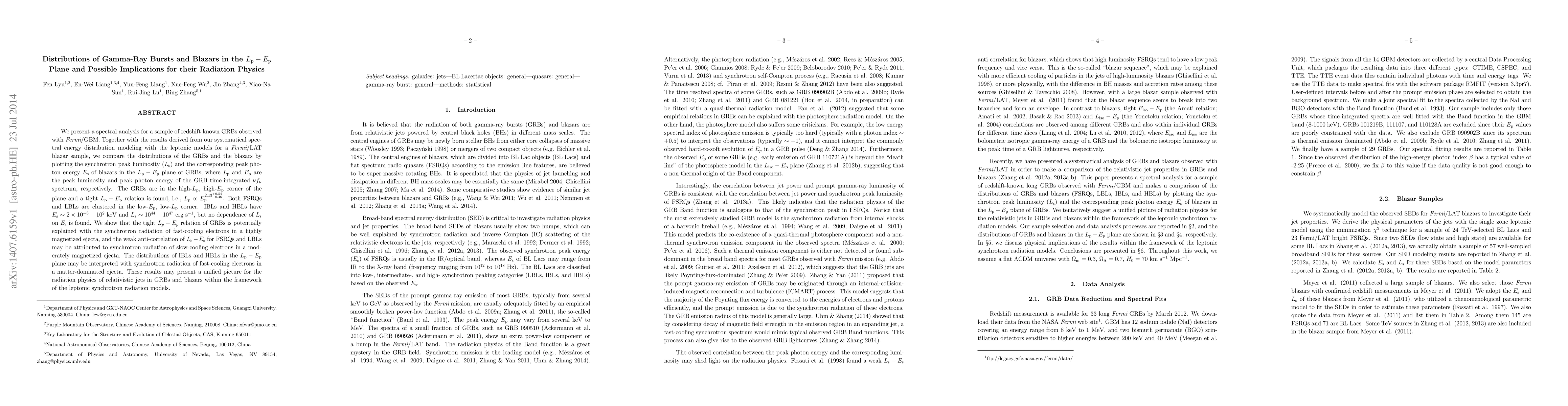 This paper analyzes the distributions of gamma-ray bursts (GRBs) and blazars in the $L_{\rm p}-E_{\rm p}$ plane, revealing a tight $L_{\rm p}-E_{\rm p}$ relation for GRBs and suggesting that their radiation physics can be explained by synchrotron radiation from different electron cooling regimes in relativistic jets.