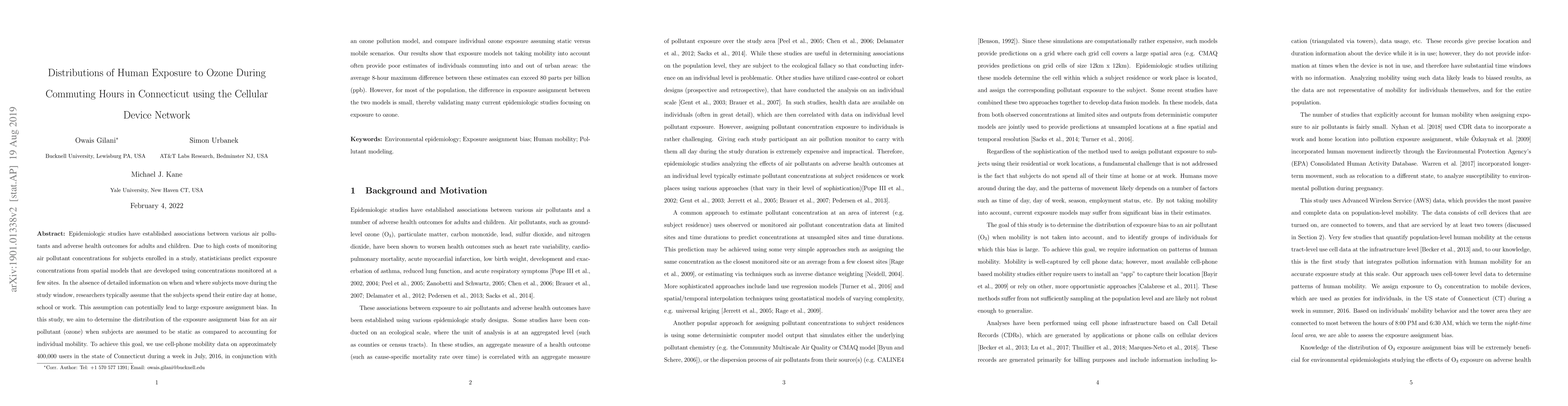 This study uses cell-phone mobility data to assess human exposure to ozone during commuting hours in Connecticut, comparing static versus mobile exposure models. Results indicate significant exposure bias when mobility is ignored, with average differences exceeding 80 ppb, though most populations show small differences, supporting many current ozone exposure studies.