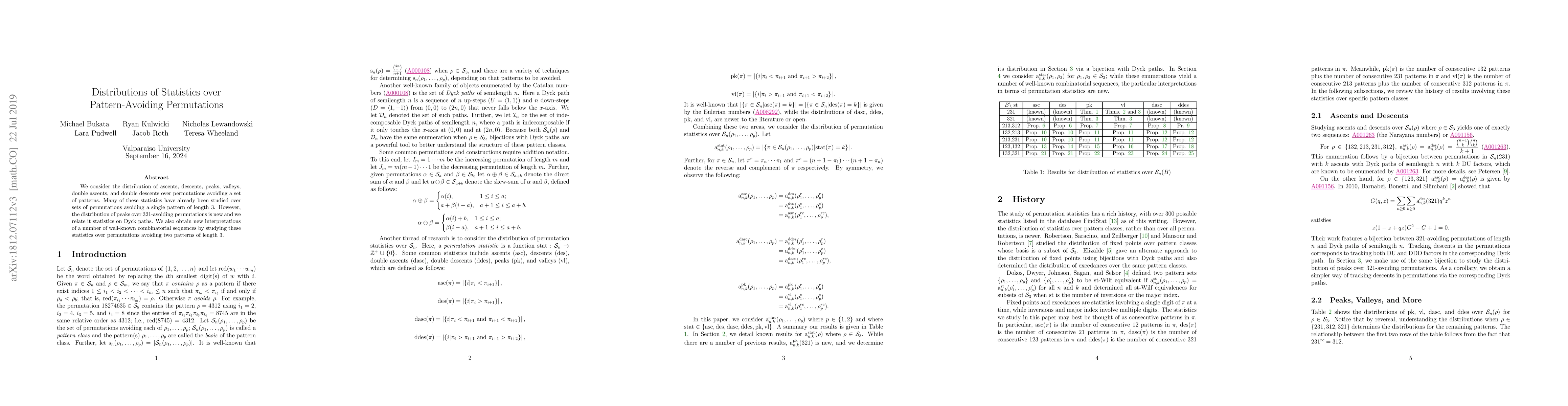 This paper examines the distribution of various statistics such as ascents, peaks, and double ascents over permutations that avoid specific pattern sets, with a focus on the novel distribution of peaks in 321-avoiding permutations linked to statistics on Dyck paths, and new interpretations of combinatorial sequences via two-pattern-avoiding permutations.