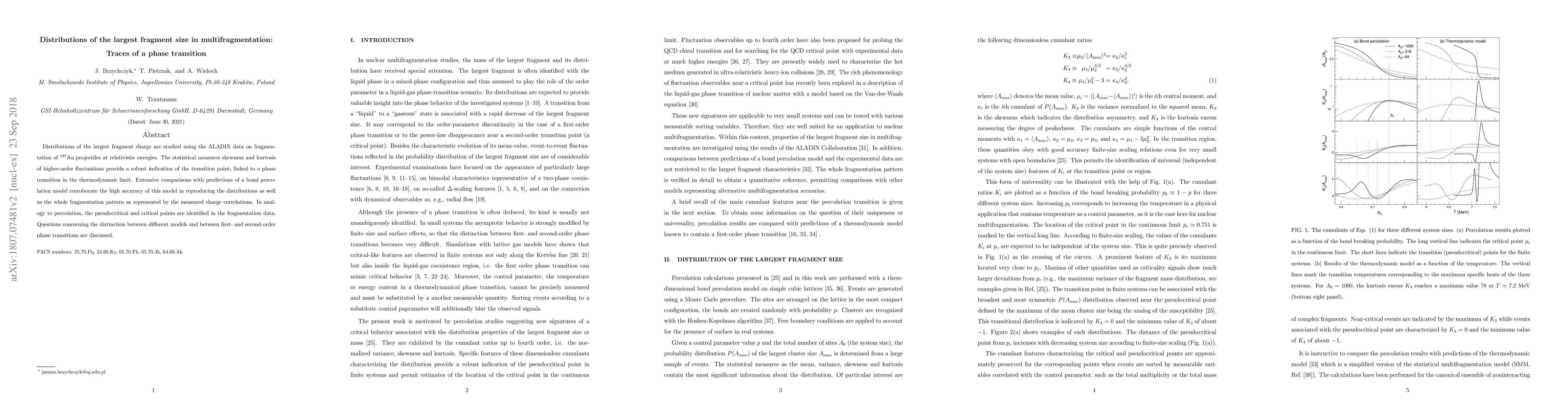 This paper investigates the largest fragment size distributions in relativistic gold projectile fragmentation using ALADIN data, finding strong evidence for a phase transition through statistical measures. The bond percolation model accurately reproduces these distributions, identifying pseudocritical and critical points akin to percolation, and raises questions about the nature of different phase transitions.