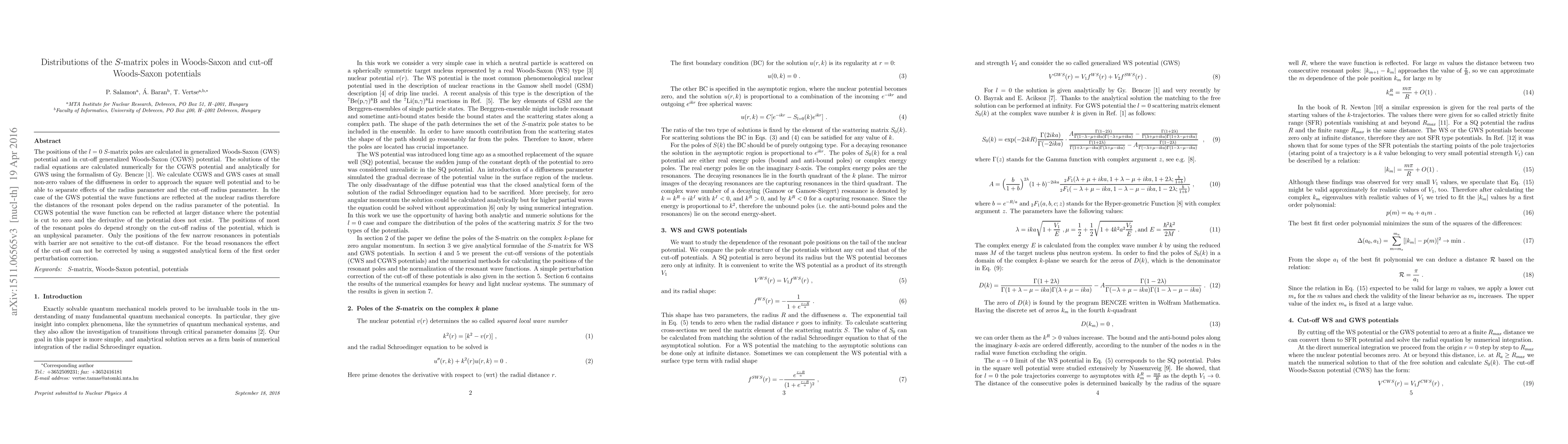 The positions of the $l=0$ $S$-matrix poles are calculated in generalized Woods-Saxon (GWS) potential and in cut-off generalized Woods-Saxon (CGWS) potential. The solutions of the radial equations are calculated numerically for the CGWS potential and analytically for GWS using the formalism of Gy. Bencze \cite{[Be66]}. We calculate CGWS and GWS cases at small non-zero values of the diffuseness in order to approach the square well potential and to be able to separate effects of the radius parameter and the cut-off radius parameter. In the case of the GWS potential the wave functions are reflected at the nuclear radius therefore the distances of the resonant poles depend on the radius parameter of the potential. In CGWS potential the wave function can be reflected at larger distance where the potential is cut to zero and the derivative of the potential does not exist. The positions of most of the resonant poles do depend strongly on the cut-off radius of the potential, which is an unphysical parameter. Only the positions of the few narrow resonances in potentials with barrier are not sensitive to the cut-off distance. For the broad resonances the effect of the cut-off can not be corrected by using a suggested analytical form of the first order perturbation correction.