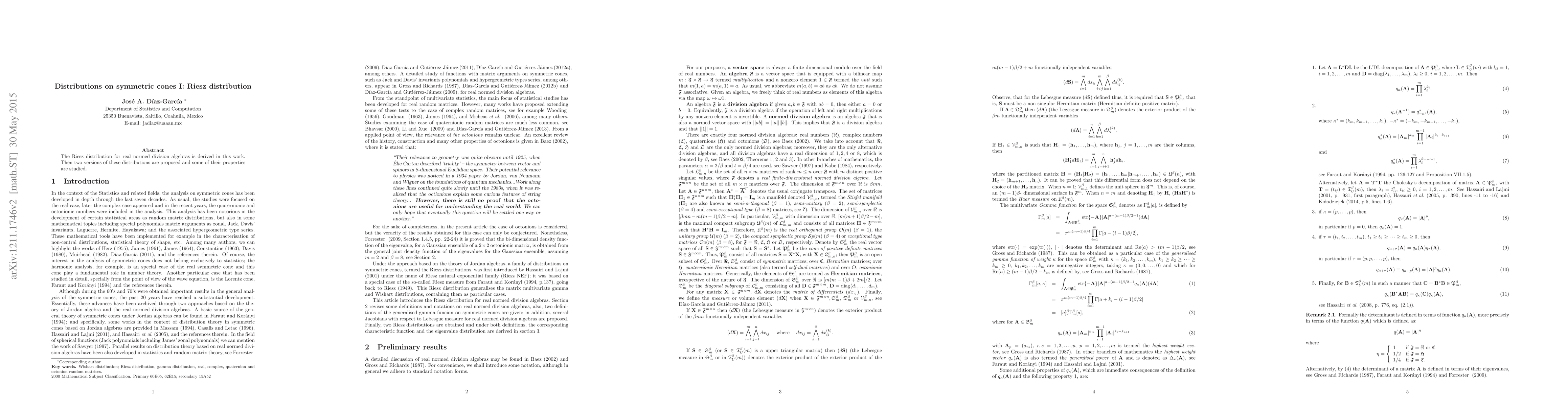 Researchers derive a Riesz distribution for real normed division algebras, proposing two versions with studied properties, aiming to understand distributions on symmetric cones.
