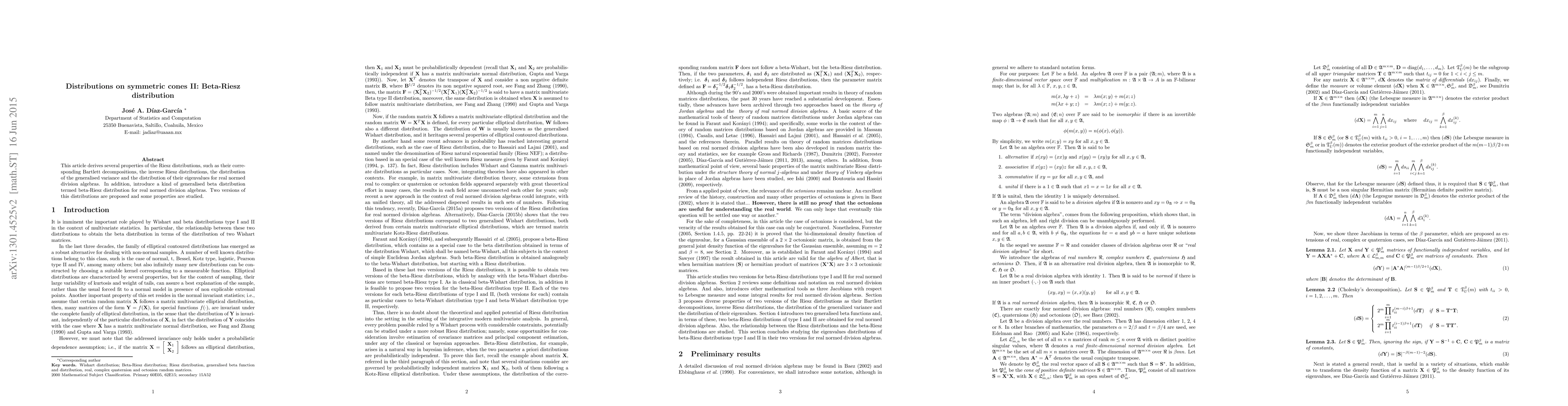 This paper explores the properties of Riesz distributions, including Bartlett decompositions and inverse distributions, and introduces a new beta-Riesz distribution for real normed division algebras, proposing two versions and studying their properties.