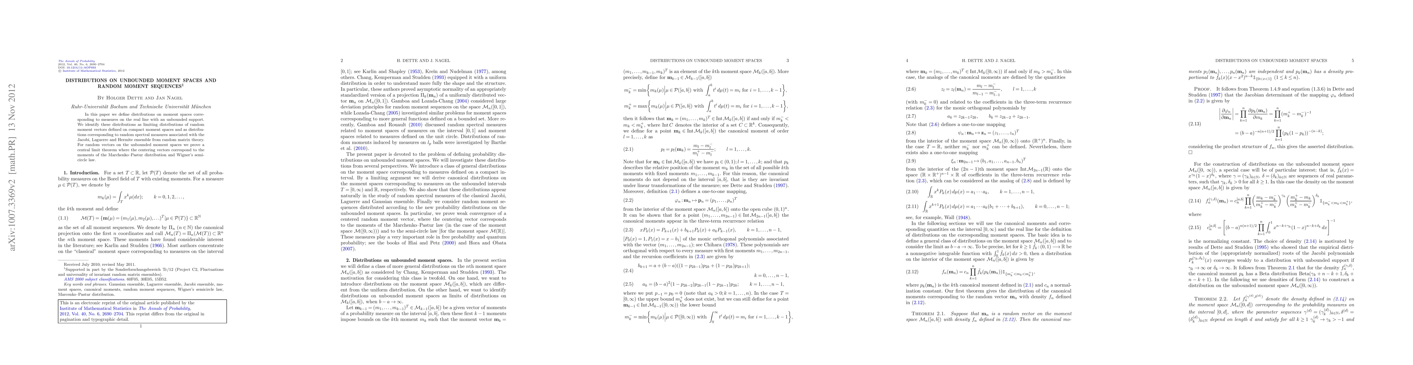 This paper introduces distributions on unbounded moment spaces and their connections to random moment vectors and spectral measures in random matrix theory. It proves a central limit theorem for these distributions, linking them to the Marchenko-Pastur distribution and Wigner's semi-circle law.
