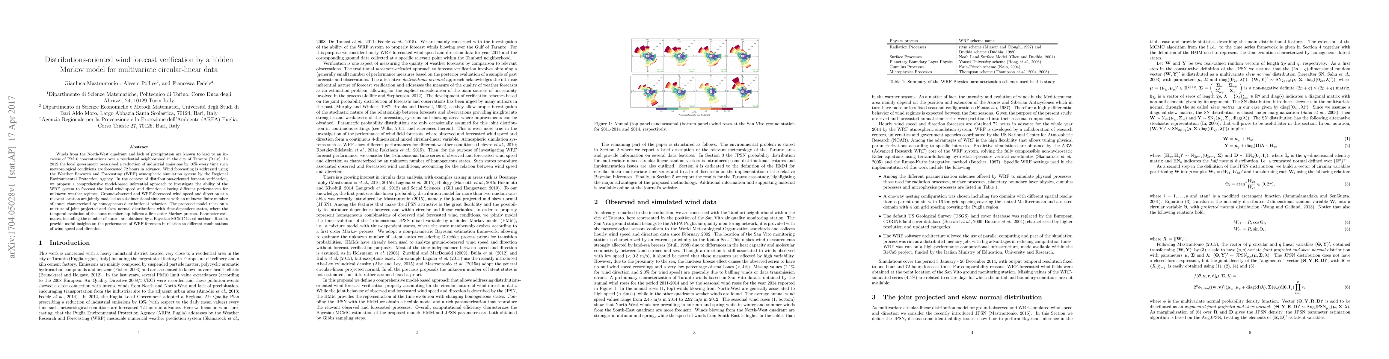 Winds from the North-West quadrant and lack of precipitation are known to lead to an increase of PM10 concentrations over a residential neighborhood in the city of Taranto (Italy). In 2012 the local government prescribed a reduction of industrial emissions by 10% every time such meteorological conditions are forecasted 72 hours in advance. Wind forecasting is addressed using the Weather Research and Forecasting (WRF) atmospheric simulation system by the Regional Environmental Protection Agency. In the context of distributions-oriented forecast verification, we propose a comprehensive model-based inferential approach to investigate the ability of the WRF system to forecast the local wind speed and direction allowing different performances for unknown weather regimes. Ground-observed and WRF-forecasted wind speed and direction at a relevant location are jointly modeled as a 4-dimensional time series with an unknown finite number of states characterized by homogeneous distributional behavior. The proposed model relies on a mixture of joint projected and skew normal distributions with time-dependent states, where the temporal evolution of the state membership follows a first order Markov process. Parameter estimates, including the number of states, are obtained by a Bayesian MCMC-based method. Results provide useful insights on the performance of WRF forecasts in relation to different combinations of wind speed and direction.
