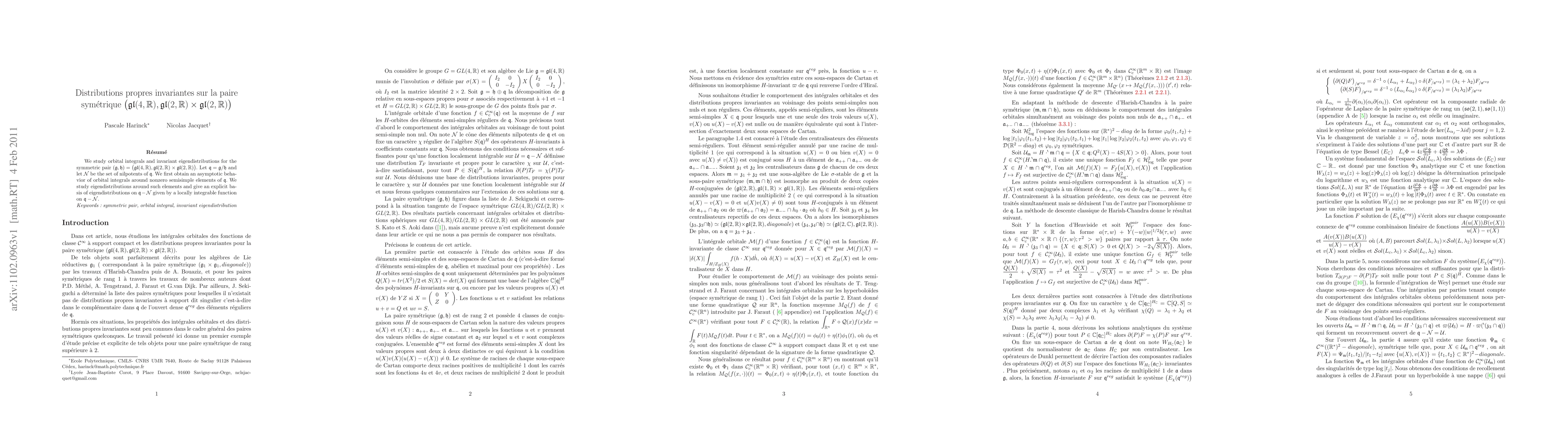 This paper investigates orbital integrals and invariant eigendistributions for the symmetric pair (g,h) = (gl(4,R), gl(2,R) * gl(2,R)). It provides an asymptotic behavior for orbital integrals around nonzero semisimple elements and presents an explicit basis for eigendistributions on the nilpotent cone of the pair.