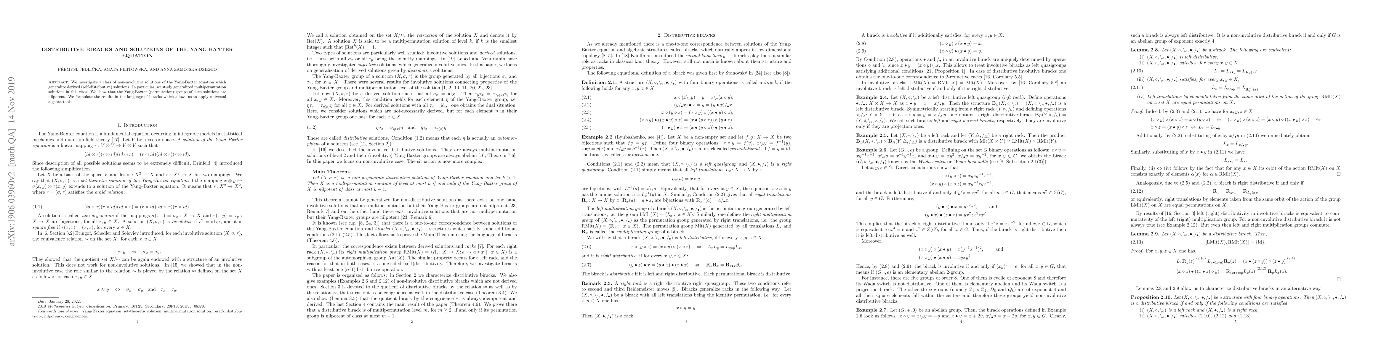 This paper explores non-involutive solutions of the Yang-Baxter equation, specifically distributive biracks, and demonstrates that the associated Yang-Baxter (permutation) groups are nilpotent. The study generalizes self-distributive solutions and focuses on generalized multipermutation solutions.