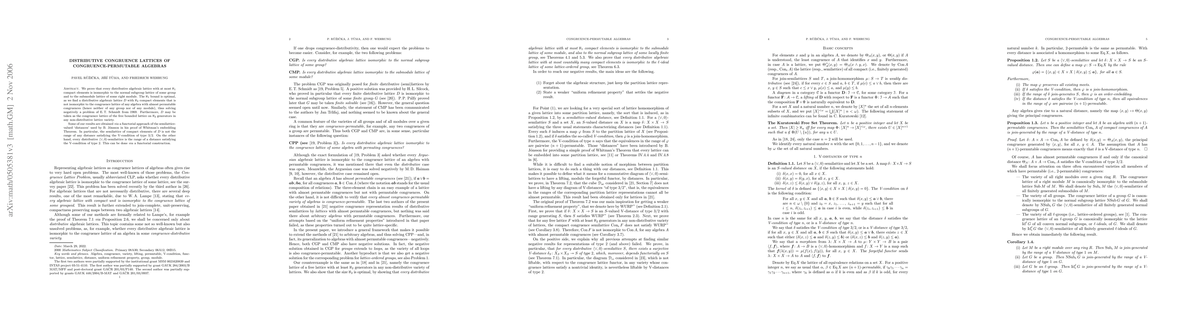We prove that every distributive algebraic lattice with at most $\aleph\_1$ compact elements is isomorphic to the normal subgroup lattice of some group and to the submodule lattice of some right module. The $\aleph\_1$ bound is optimal, as we find a distributive algebraic lattice $D$ with $\aleph\_2$ compact elements that is not isomorphic to the congruence lattice of any algebra with almost permutable congruences (hence neither of any group nor of any module), thus solving negatively a problem of E. T. Schmidt from 1969. Furthermore, $D$ may be taken as the congruence lattice of the free bounded lattice on $\aleph\_2$ generators in any non-distributive lattice variety. Some of our results are obtained via a functorial approach of the semilattice-valued "distances" used by B. Jonsson in his proof of Whitman's embedding Theorem. In particular, the semilattice of compact elements of $D$ is not the range of any distance satisfying the V-condition of type 3/2. On the other hand, every distributive join-semilattice with zero is the range of a distance satisfying the V-condition of type 2. This can be done via a functorial construction.