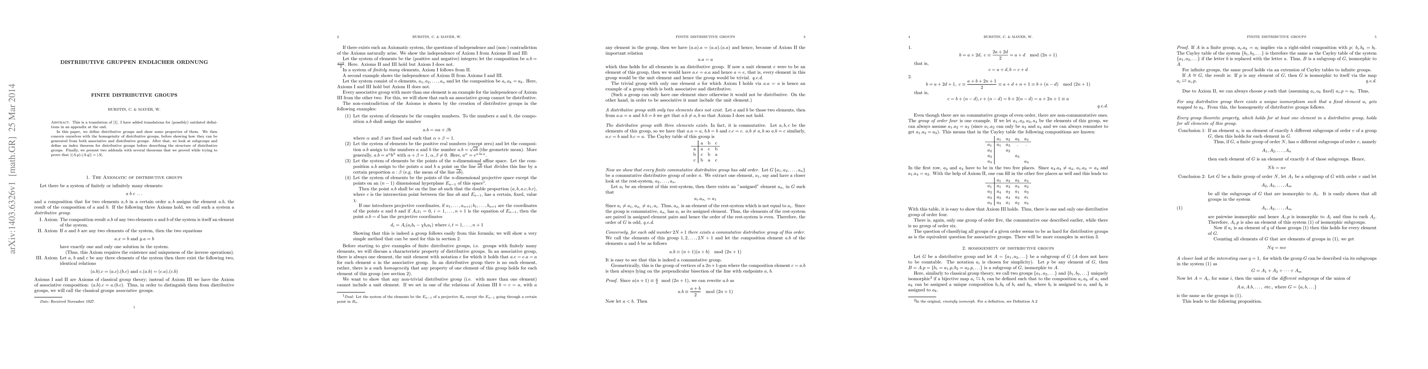 This is a translation. I have added translations for (possibly) outdated definitions in an appendix at the end. In this paper, we define distributive groups and show some properties of them. We then concern ourselves with the homogeinity of distributive groups, before showing how they can be generated from both associative and distributive groups. After that, we look at subgroups and define an index theorem for distributive groups before describing the structure of distributive groups. Finally, we present two addenda with several theorems that we proved while trying to prove that $\left|(A.p).(A.q)\right|=\left|A\right|$.