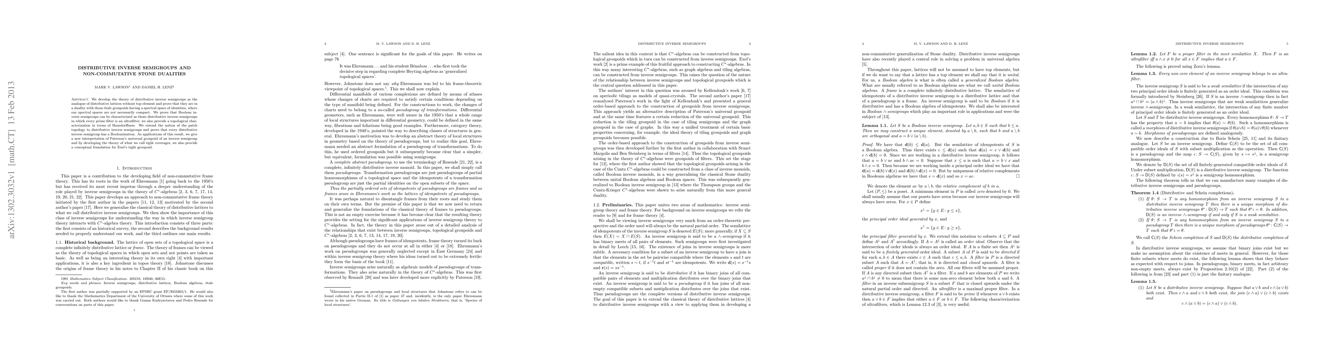 We develop the theory of distributive inverse semigroups as the analogue of distributive lattices without top element and prove that they are in a duality with those etale groupoids having a spectral space of identities, where our spectral spaces are not necessarily compact. We prove that Boolean inverse semigroups can be characterized as those distributive inverse semigroups in which every prime filter is an ultrafilter; we also provide a topological characterization in terms of Hausdorffness. We extend the notion of the patch topology to distributive inverse semigroups and prove that every distributive inverse semigroup has a Booleanization. As applications of this result, we give a new interpretation of Paterson's universal groupoid of an inverse semigroup and by developing the theory of what we call tight coverages, we also provide a conceptual foundation for Exel's tight groupoid.