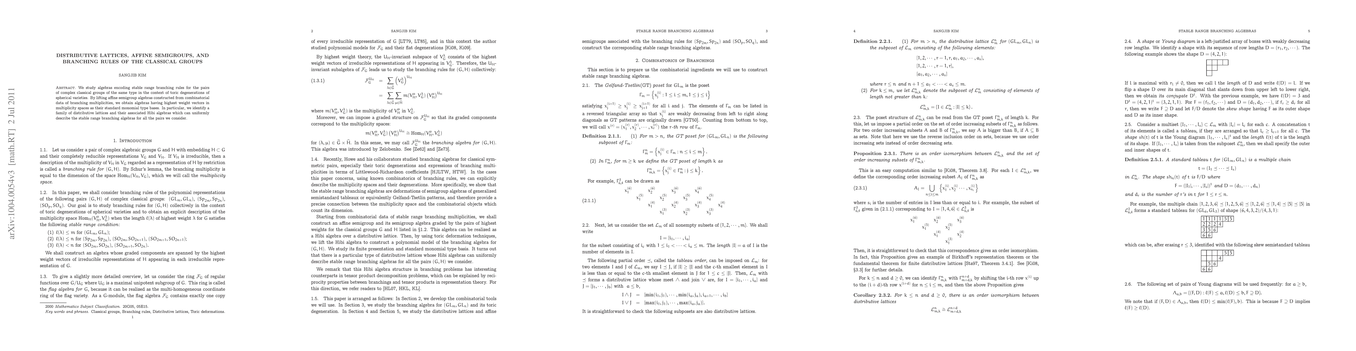 This paper explores algebras that encode stable range branching rules for pairs of complex classical groups, focusing on toric degenerations of spherical varieties. It identifies a family of distributive lattices and Hibi algebras that uniformly describe these branching algebras through affine semigroup algebras derived from combinatorial data.