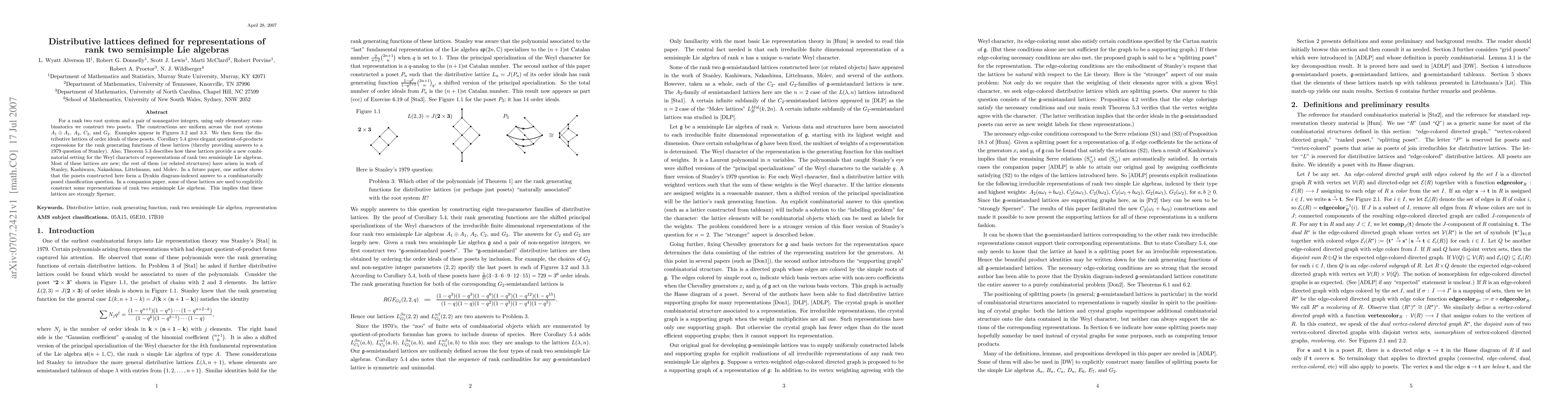 This paper constructs distributive lattices from posets defined for rank two semisimple Lie algebras using elementary combinatorics, providing new insights into Weyl characters and rank generating functions, answering a 1979 question of Stanley. The lattices are also shown to be strongly Sperner and form a basis for classifying representations of such Lie algebras.