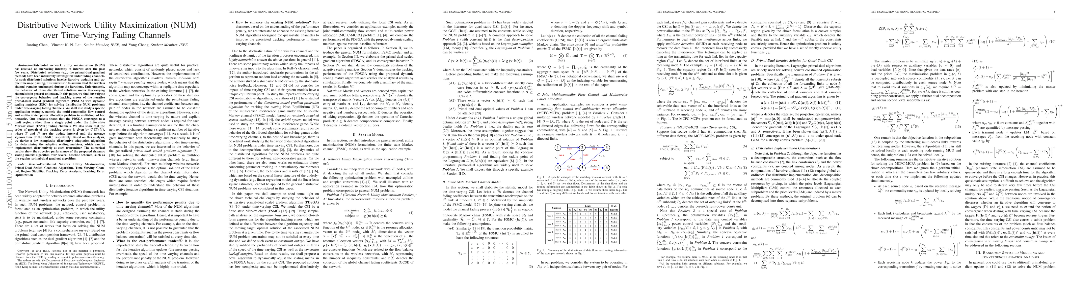 This paper investigates the convergence behavior and tracking errors of the iterative primal-dual scaled gradient algorithm (PDSGA) for solving distributive network utility maximization (NUM) problems under time-varying fading channels. The analysis reveals that PDSGA converges to a limit region rather than a single point, and proposes a low complexity adaptive scaling matrix algorithm for dynamic channel conditions.
