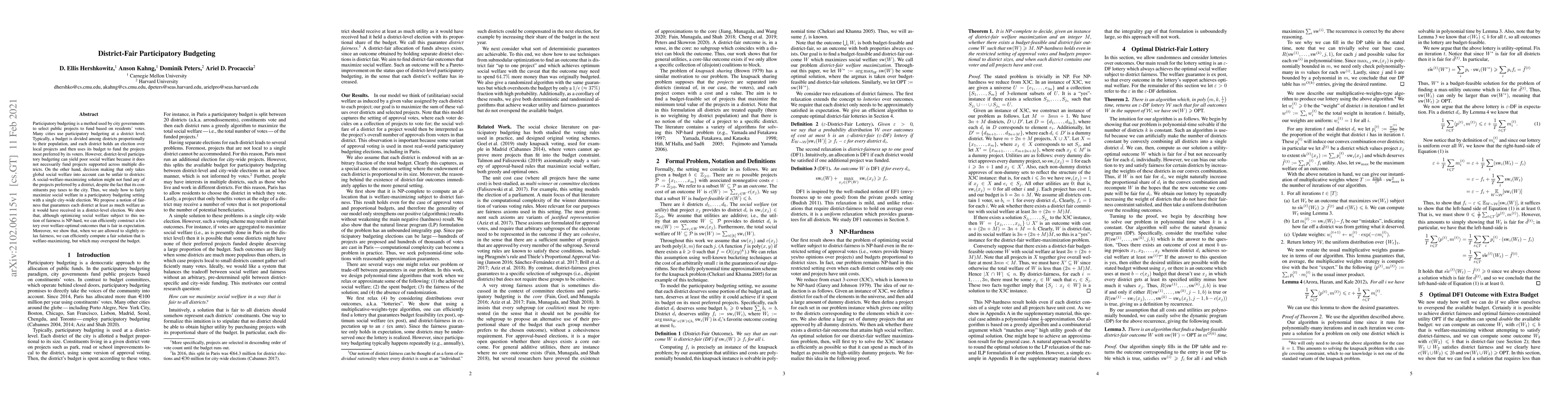 The research proposes a notion of district-fairness in participatory budgeting, ensuring each district receives at least as much welfare as in a district-level election. It demonstrates that while optimizing social welfare subject to this fairness notion is NP-hard, a fair lottery over welfare-optimal outcomes can be constructed efficiently in expectation.