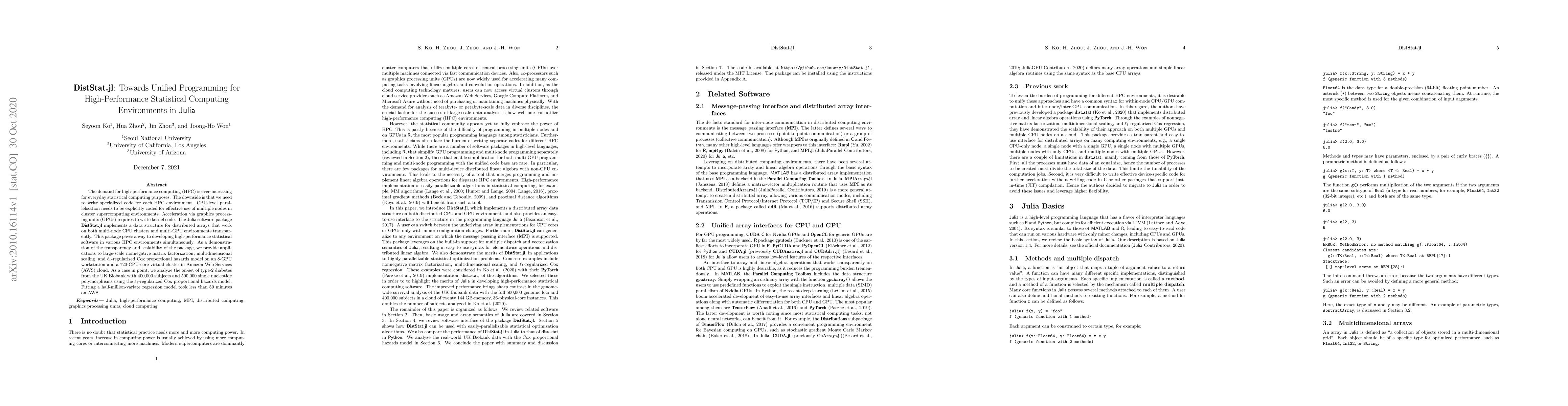 DistStat.jl facilitates unified programming for high-performance statistical computing across multi-node CPU clusters and multi-GPU environments in Julia. It demonstrates scalability and transparency through applications like large-scale nonnegative matrix factorization and $\ell_1$-regularized Cox proportional hazards model, achieving efficient computation on both 8-GPU workstations and 720-CPU-core AWS clusters.