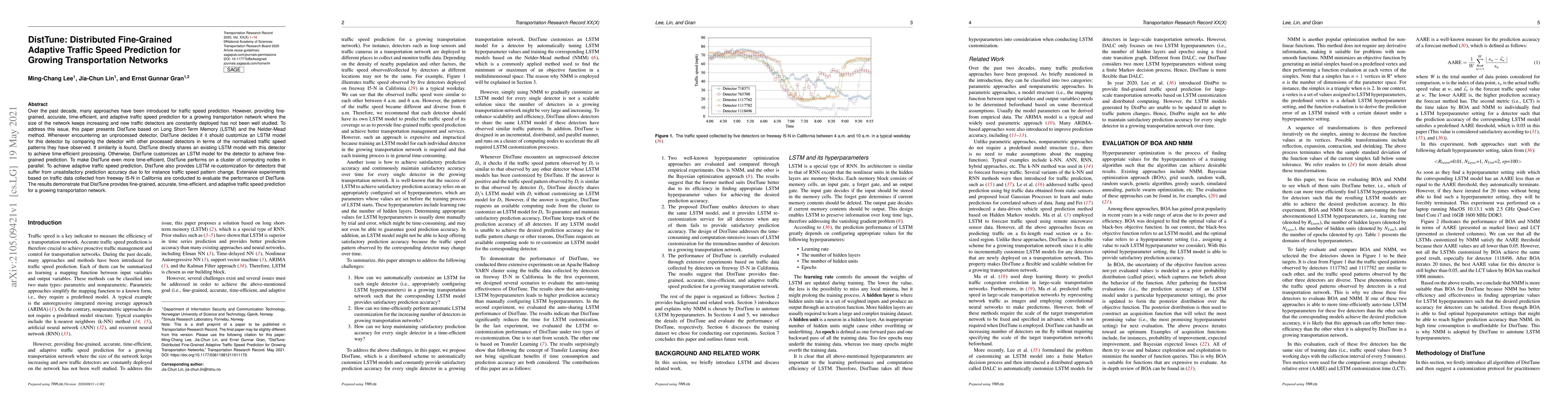 DistTune employs LSTM and the Nelder-Mead method for adaptive, fine-grained traffic speed prediction in expanding transportation networks. It customizes LSTM models for new detectors based on similarity in traffic patterns, sharing models for similar detectors to enhance efficiency.