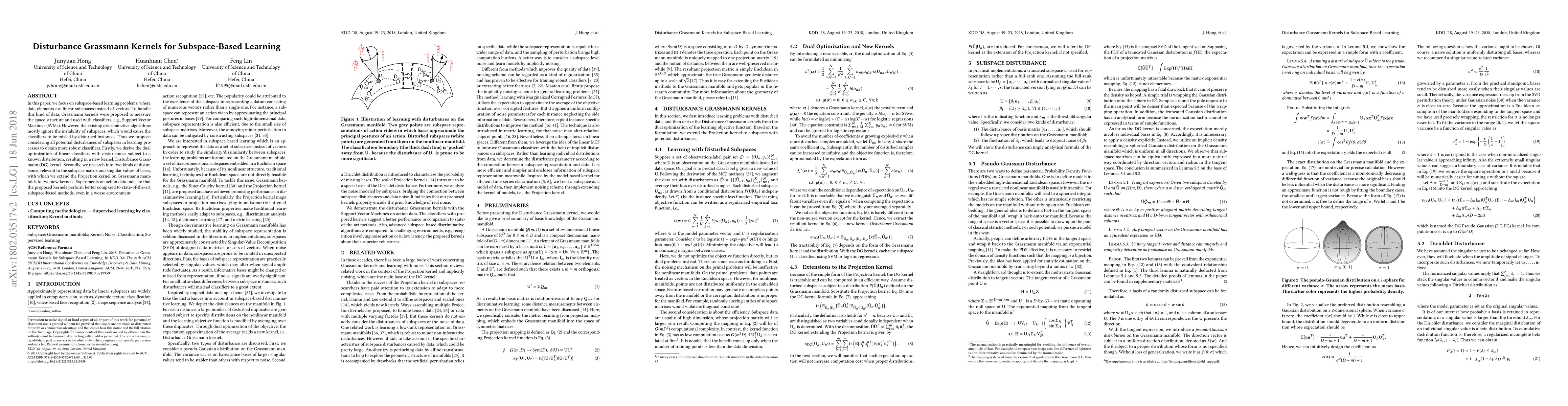 The paper presents Disturbance Grassmann Kernels (DGKs), which extend the Projection kernel by considering Gaussian-like noise in subspace matrices and Dirichlet noise in singular values, providing a more robust approach to subspace-based learning problems.