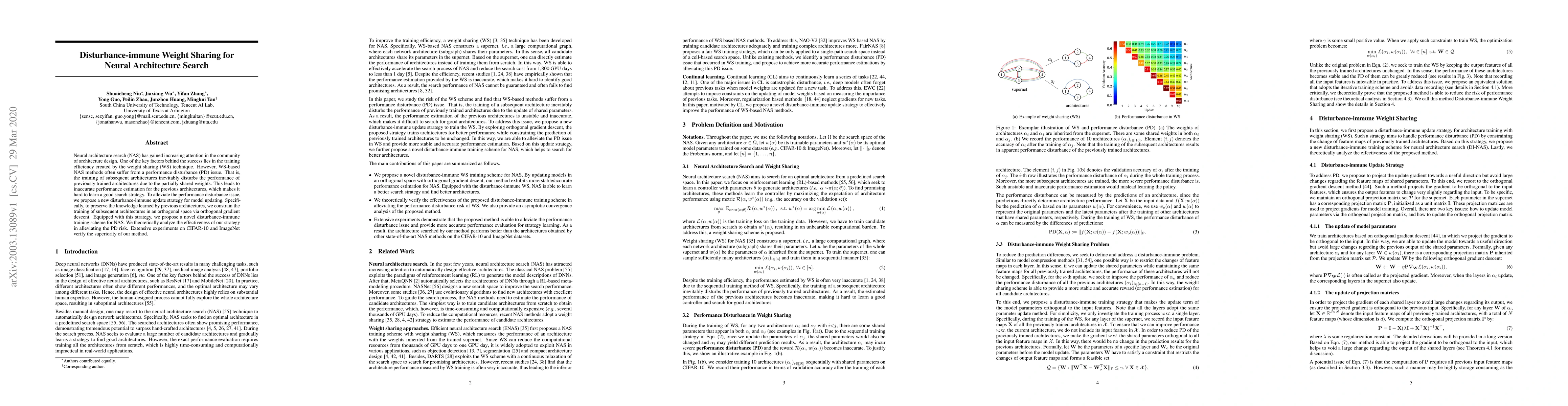 Neural architecture search (NAS) has gained increasing attention in the community of architecture design. One of the key factors behind the success lies in the training efficiency created by the weight sharing (WS) technique. However, WS-based NAS methods often suffer from a performance disturbance (PD) issue. That is, the training of subsequent architectures inevitably disturbs the performance of previously trained architectures due to the partially shared weights. This leads to inaccurate performance estimation for the previous architectures, which makes it hard to learn a good search strategy. To alleviate the performance disturbance issue, we propose a new disturbance-immune update strategy for model updating. Specifically, to preserve the knowledge learned by previous architectures, we constrain the training of subsequent architectures in an orthogonal space via orthogonal gradient descent. Equipped with this strategy, we propose a novel disturbance-immune training scheme for NAS. We theoretically analyze the effectiveness of our strategy in alleviating the PD risk. Extensive experiments on CIFAR-10 and ImageNet verify the superiority of our method.