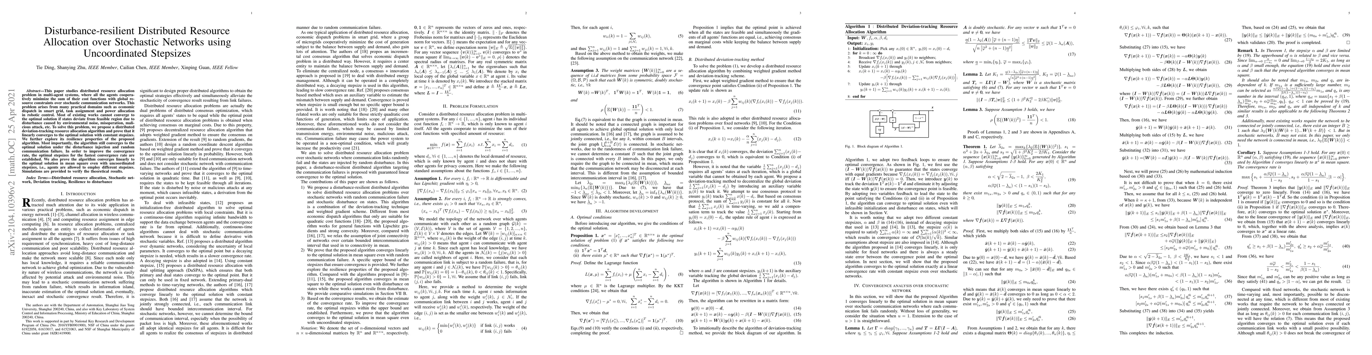 A new algorithm for distributed resource allocation in multi-agent systems is proposed to maintain convergence under stochastic communication networks and disturbances, achieving linear convergence with constant or optimal stepsizes.