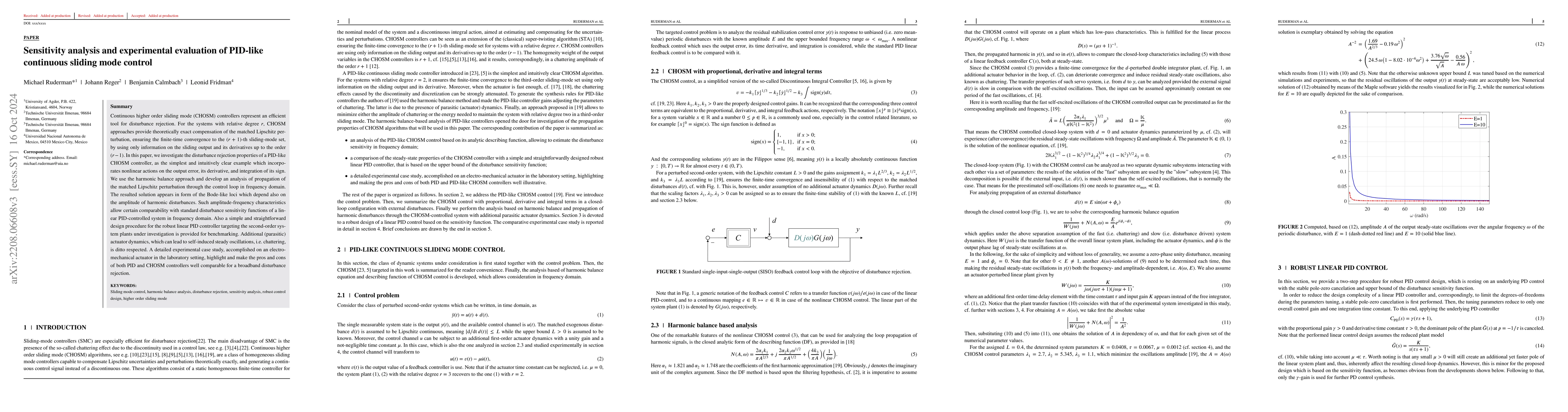 Continuous higher order sliding mode (CHOSM) controllers are new efficient tool for disturbance rejection. For the systems with relative degree r, CHOSM provide theoretically exact compensation of Lipschitz matched perturbation ensuring the finite-time convergence to the (r+1)-th sliding-mode set using only information on the sliding output and its derivatives up to the order (r-1). In this paper, we investigate the properties of disturbance rejection for a PID-like controller, as the simplest and intuitively clear example of CHOSM one, allowing a harmonic balance-based consideration of the residual steady-state oscillations, i.e. chattering. We provide additional analysis of the PID-like controller based on its analytic describing function and the disturbance sensitivity function, allowing certain comparability with the standard linear PID control in frequency domain. For comparison reason a simple and straightforward design procedure for robust PID controller, which is served by the assumed upper bound of the disturbance sensitivity function, is developed. A detailed experimental case study, accomplished on an electro-mechanical actuator in the laboratory setting, highlight and make the pros and cons of both PID and CHOSM controllers well comparable for a broadband disturbance rejection.