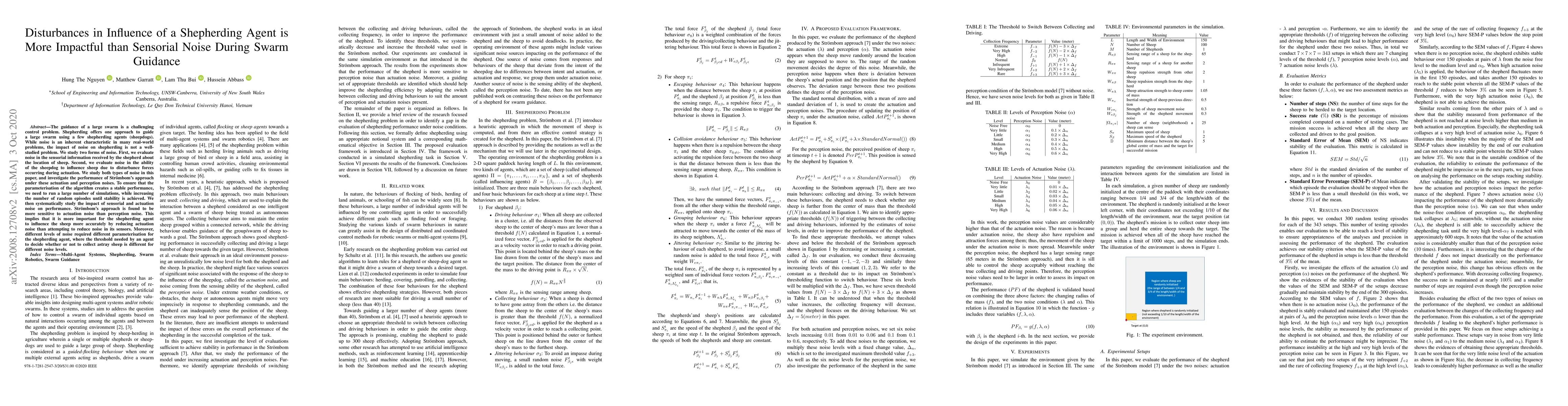 The guidance of a large swarm is a challenging control problem. Shepherding offers one approach to guide a large swarm using a few shepherding agents (sheepdogs). While noise is an inherent characteristic in many real-world problems, the impact of noise on shepherding is not a well-studied problem. We study two forms of noise. First, we evaluate noise in the sensorial information received by the shepherd about the location of sheep. Second, we evaluate noise in the ability of the sheepdog to influence sheep due to disturbance forces occurring during actuation. We study both types of noise in this paper, and investigate the performance of Str\"{o}mbom's approach under these actuation and perception noises. To ensure that the parameterisation of the algorithm creates a stable performance, we need to run a large number of simulations, while increasing the number of random episodes until stability is achieved. We then systematically study the impact of sensorial and actuation noise on performance. Str\"{o}mbom's approach is found to be more sensitive to actuation noise than perception noise. This implies that it is more important for the shepherding agent to influence the sheep more accurately by reducing actuation noise than attempting to reduce noise in its sensors. Moreover, different levels of noise required different parameterisation for the shepherding agent, where the threshold needed by an agent to decide whether or not to collect astray sheep is different for different noise levels.