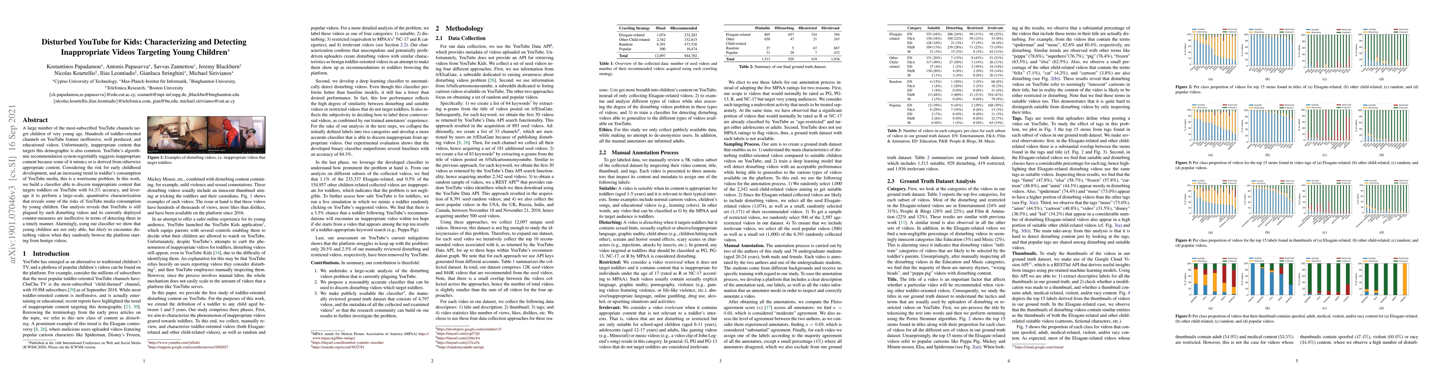 This paper develops a classifier to detect inappropriate videos targeting toddlers on YouTube, achieving 84.3% accuracy. The study reveals that despite the presence of such content, YouTube's recommendation system and current countermeasures fail to effectively prevent young children from encountering disturbing videos.