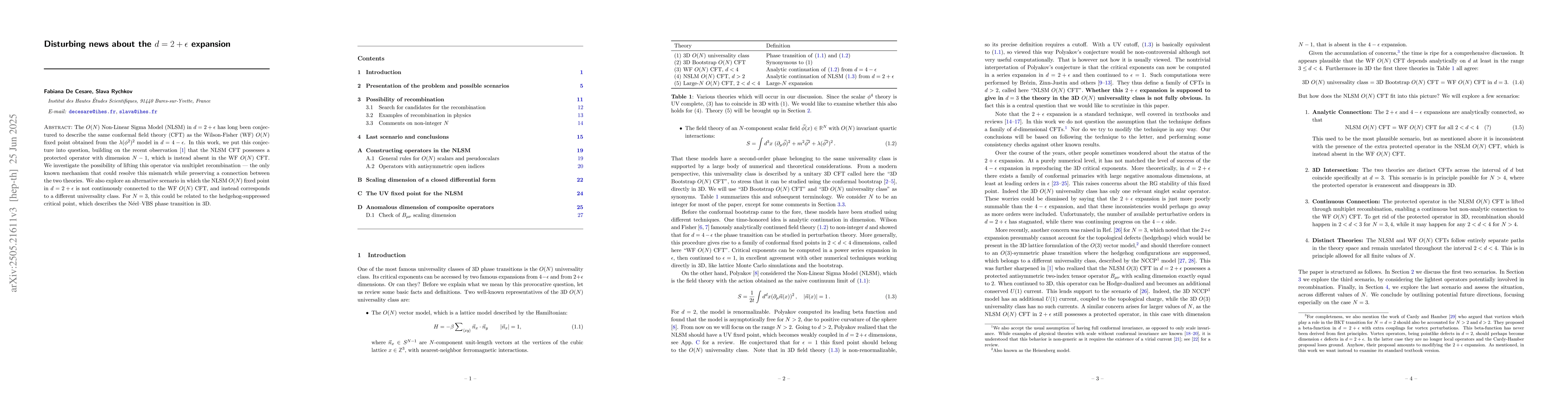 The research investigates the $O(N)$ Non-Linear Sigma Model (NLSM) in $d=2+\epsilon$ dimensions, comparing it to the Wilson-Fisher (WF) $O(N)$ fixed point in $d=4-\epsilon$. It focuses on the protected operator dimension mismatch between NLSM and WF CFTs, particularly for $N=3$, examining multiplet recombination as a potential resolution.