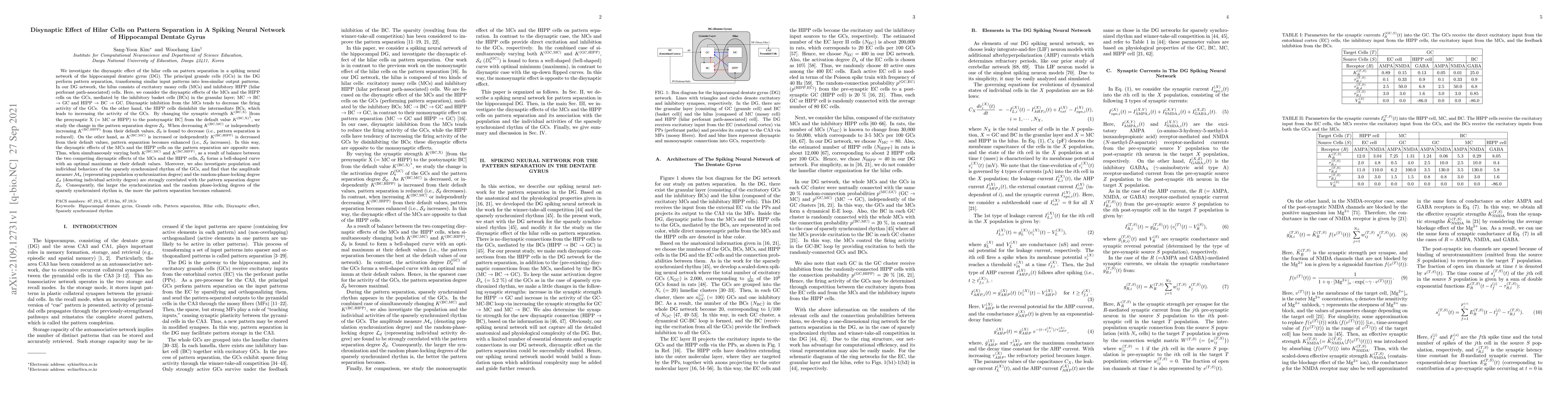 This paper explores how disynaptic connections from mossy cells and hilar perforant path-associated cells via basket cells influence pattern separation in the hippocampal dentate gyrus. It finds that the degree of pattern separation varies inversely with the synaptic strength from mossy cells and directly with that from hilar cells, leading to an optimal pattern separation at default synaptic strengths.