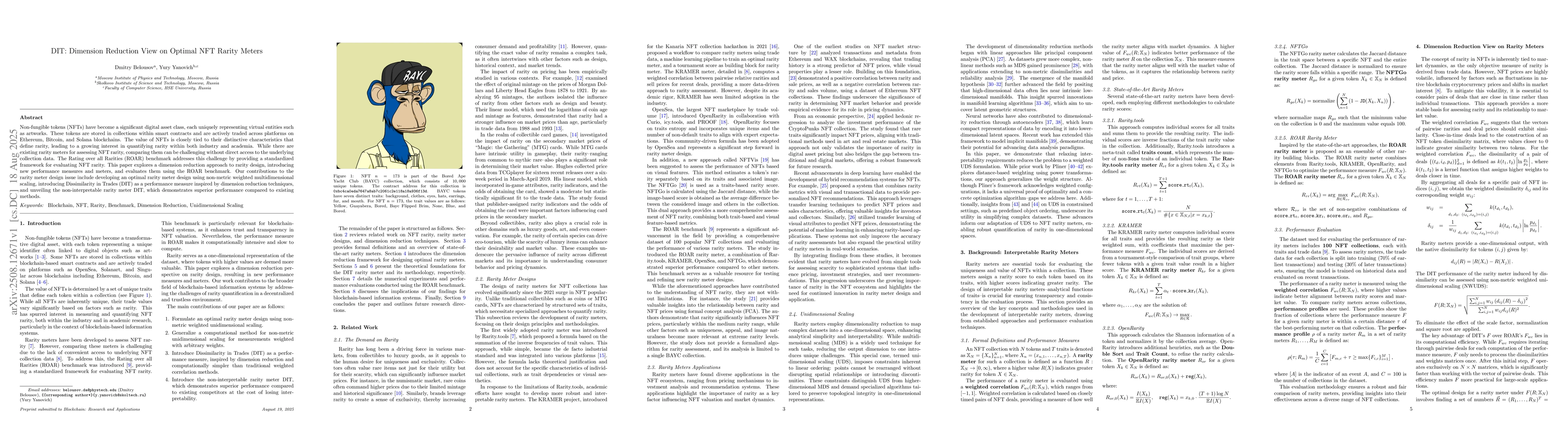 Non-fungible tokens (NFTs) have become a significant digital asset class, each uniquely representing virtual entities such as artworks. These tokens are stored in collections within smart contracts and are actively traded across platforms on Ethereum, Bitcoin, and Solana blockchains. The value of NFTs is closely tied to their distinctive characteristics that define rarity, leading to a growing interest in quantifying rarity within both industry and academia. While there are existing rarity meters for assessing NFT rarity, comparing them can be challenging without direct access to the underlying collection data. The Rating over all Rarities (ROAR) benchmark addresses this challenge by providing a standardized framework for evaluating NFT rarity. This paper explores a dimension reduction approach to rarity design, introducing new performance measures and meters, and evaluates them using the ROAR benchmark. Our contributions to the rarity meter design issue include developing an optimal rarity meter design using non-metric weighted multidimensional scaling, introducing Dissimilarity in Trades (DIT) as a performance measure inspired by dimension reduction techniques, and unveiling the non-interpretable rarity meter DIT, which demonstrates superior performance compared to existing methods.