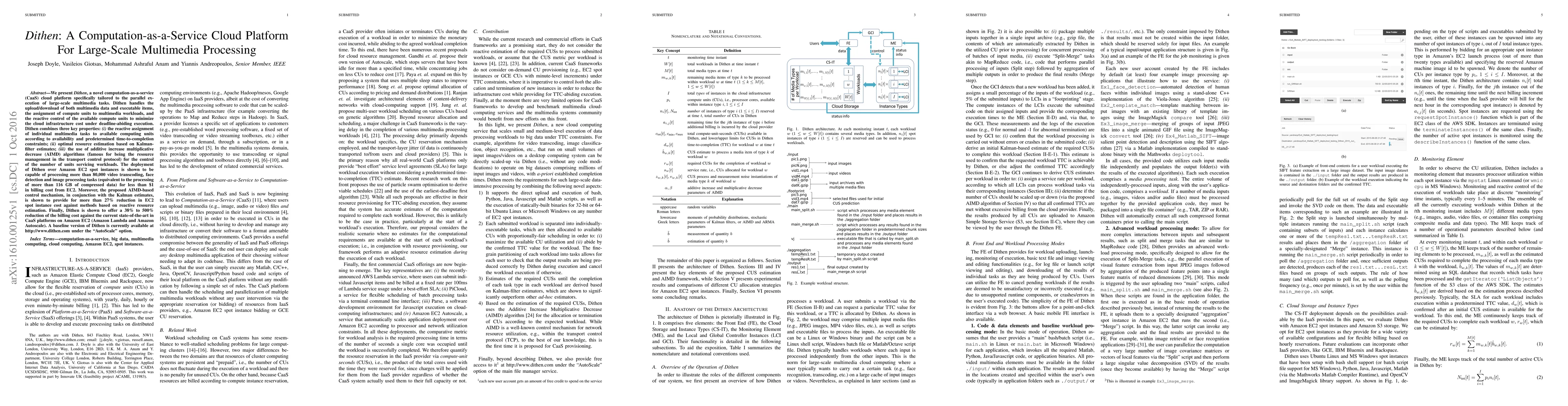 Dithen is a computation-as-a-service cloud platform designed for efficient parallel processing of large-scale multimedia tasks, achieving cost-effective execution through reactive resource allocation and advanced resource management algorithms. It demonstrates significant cost reductions compared to existing CaaS platforms on Amazon EC2.