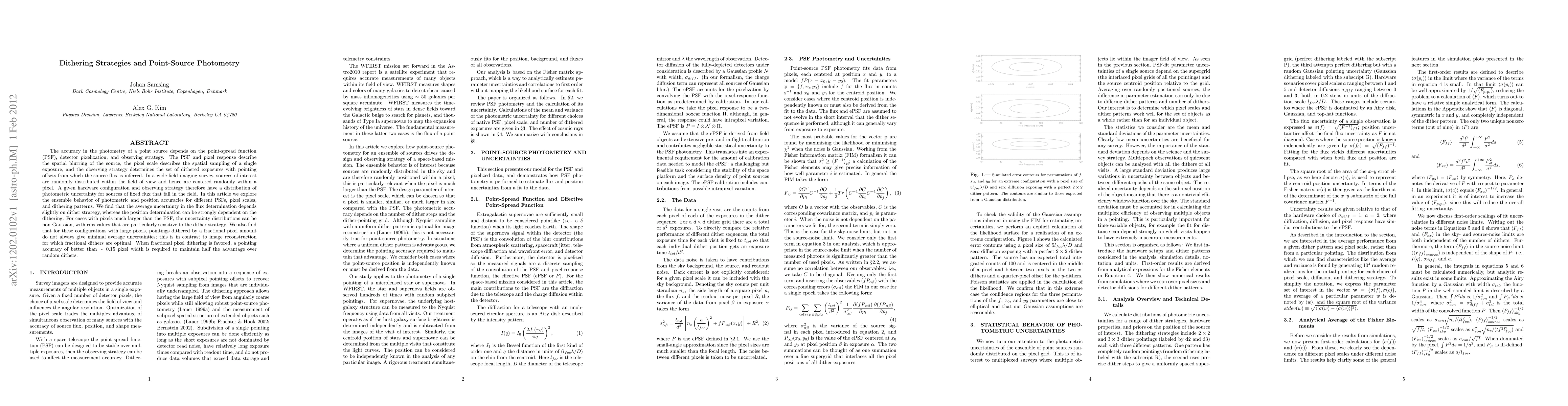The accuracy in the photometry of a point source depends on the point-spread function (PSF), detector pixelization, and observing strategy. The PSF and pixel response describe the spatial blurring of the source, the pixel scale describes the spatial sampling of a single exposure, and the observing strategy determines the set of dithered exposures with pointing offsets from which the source flux is inferred. In a wide-field imaging survey, sources of interest are randomly distributed within the field of view and hence are centered randomly within a pixel. A given hardware configuration and observing strategy therefore have a distribution of photometric uncertainty for sources of fixed flux that fall in the field. In this article we explore the ensemble behavior of photometric and position accuracies for different PSFs, pixel scales, and dithering patterns. We find that the average uncertainty in the flux determination depends slightly on dither strategy, whereas the position determination can be strongly dependent on the dithering. For cases with pixels much larger than the PSF, the uncertainty distributions can be non-Gaussian, with rms values that are particularly sensitive to the dither strategy. We also find that for these configurations with large pixels, pointings dithered by a fractional pixel amount do not always give minimal average uncertainties; this is in contrast to image reconstruction for which fractional dithers are optimal. When fractional pixel dithering is favored, a pointing accuracy of better than $\sim 0.15$ pixel width is required to maintain half the advantage over random dithers.
