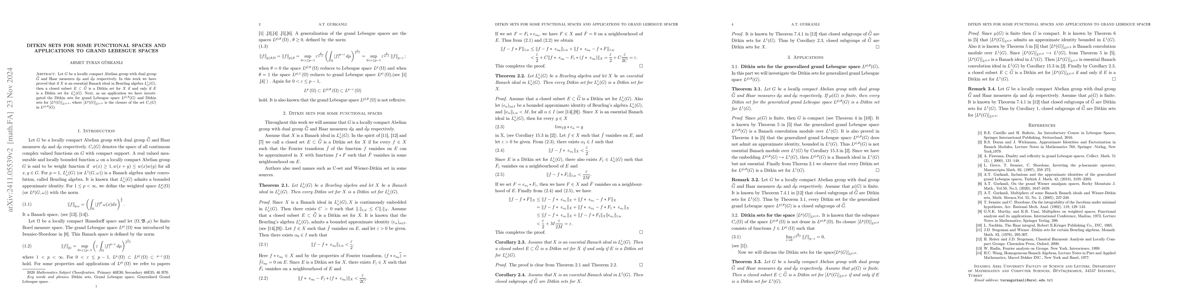 Let $G$ be a locally compact Abelian group with dual group $\widehat G $ and Haar measures $d\mu$ and $\hat d\mu$ respectively. In this work we have proved that if $X$ is an essential Banach ideal in Beurling algebra $ L^1_{\omega}(G),$ then a closed subset $E\subset \widehat G$ is a Ditkin set for $X$ if and only if $E$ is a Ditkin set for $ L^1_{\omega}(G).$ Next, as an application we have investigated the Ditkin sets for grand Lebesgue space $L^{p),\theta}(G)$ and Ditkin sets for $[L^p(G)]_{L^{p),\theta }}$, where $[L^p(G)]_{L^{p),\theta }}$ is the closure of the set $C_c(G)$ in $L^{p),\theta}(G)$.