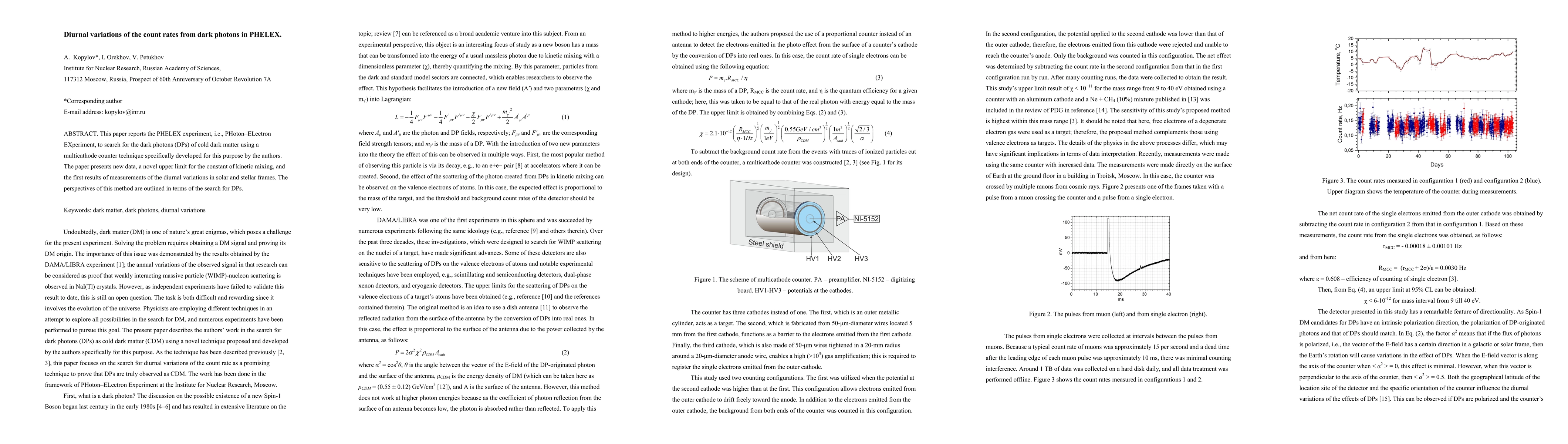 We describe the experiment PHELEX (PHoton-ELectron EXperiment) on the search for dark photons of cold dark matter using a technique of multi-cathode counter developed by us for this task. We present the new data, the new upper limit for the constant of kinetic mixing and also first results of measurements of the diurnal variations in solar and stellar frames. We outline the perspectives of this method for the search of dark photons
