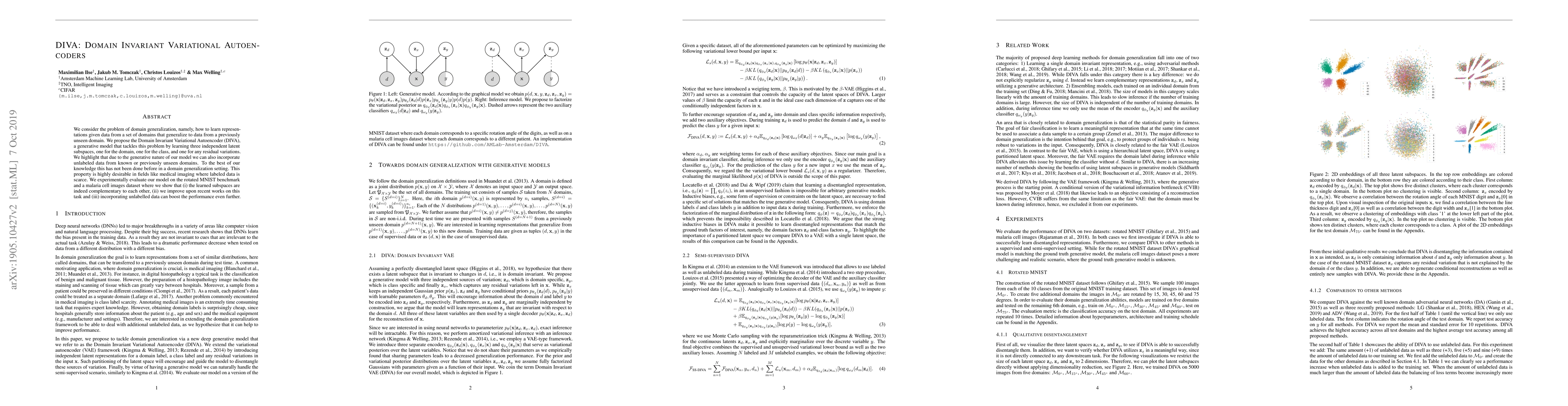 We consider the problem of domain generalization, namely, how to learn representations given data from a set of domains that generalize to data from a previously unseen domain. We propose the Domain Invariant Variational Autoencoder (DIVA), a generative model that tackles this problem by learning three independent latent subspaces, one for the domain, one for the class, and one for any residual variations. We highlight that due to the generative nature of our model we can also incorporate unlabeled data from known or previously unseen domains. To the best of our knowledge this has not been done before in a domain generalization setting. This property is highly desirable in fields like medical imaging where labeled data is scarce. We experimentally evaluate our model on the rotated MNIST benchmark and a malaria cell images dataset where we show that (i) the learned subspaces are indeed complementary to each other, (ii) we improve upon recent works on this task and (iii) incorporating unlabelled data can boost the performance even further.