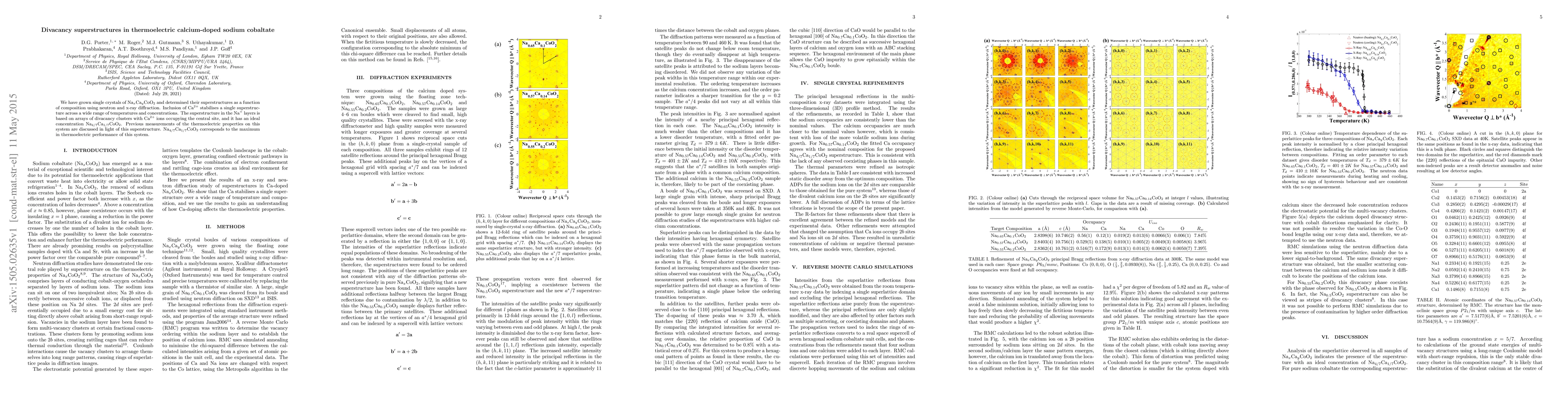 We have grown single crystals of Na$_x$Ca$_y$CoO$_2$ and determined their superstructures as a function of composition using neutron and x-ray diffraction. Inclusion of Ca$^{2+}$ stabilises a single superstructure across a wide range of temperatures and concentrations. The superstructure in the Na$^+$ layers is based on arrays of divacancy clusters with Ca$^{2+}$ ions occupying the central site, and it has an ideal concentration Na$_{4/7}$Ca$_{1/7}$CoO$_2$. Previous measurements of the thermoelectric properties on this system are discussed in light of this superstructure. Na$_{4/7}$Ca$_{1/7}$CoO$_2$ corresponds to the maximum in thermoelectric performance of this system.