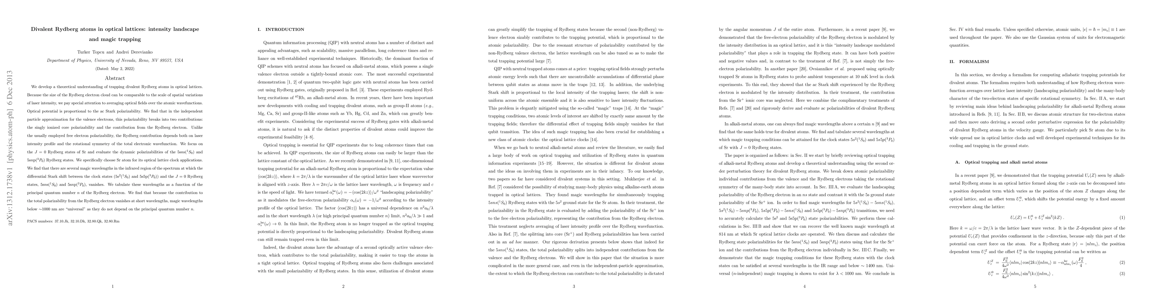 We develop a theoretical understanding of trapping divalent Rydberg atoms in optical lattices. Because the size of the Rydberg electron cloud can be comparable to the scale of spatial variations of laser intensity, we pay special attention to averaging optical fields over the atomic wavefunctions. Optical potential is proportional to the ac Stark polarizability. We find that in the independent particle approximation for the valence electrons, this polarizability breaks into two contributions: the singly ionized core polarizability and the contribution from the Rydberg electron. Unlike the usually employed free electron polarizability, the Rydberg contribution depends both on laser intensity profile and the rotational symmetry of the total electronic wavefunction. We focus on the $J=0$ Rydberg states of Sr and evaluate the dynamic polarizabilities of the 5s$n$s($^1S_0$) and 5s$n$p($^3P_0$) Rydberg states. We specifically choose Sr atom for its optical lattice clock applications. We find that there are several magic wavelengths in the infrared region of the spectrum at which the differential Stark shift between the clock states (5s$^2$($^1S_0$) and 5s5p($^3P_0$)) and the $J=0$ Rydberg states, 5s$n$s($^1S_0$) and 5s$n$p($^3P_0$), vanishes. We tabulate these wavelengths as a function of the principal quantum number $n$ of the Rydberg electron. We find that because the contribution to the total polarizability from the Rydberg electron vanishes at short wavelengths, magic wavelengths below $\sim$1000 nm are ``universal" as they do not depend on the principal quantum number $n$.