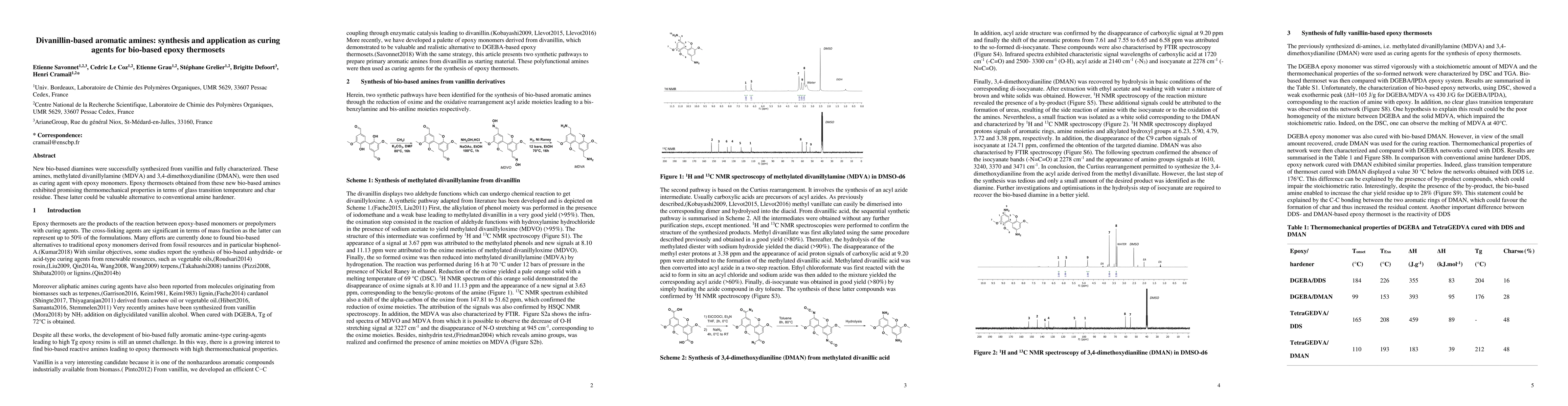 This paper synthesizes new bio-based diamines from vanillin, specifically methylated divanillylamine (MDVA) and 3,4-dimethoxydianiline (DMAN), and evaluates their use as curing agents for bio-based epoxy thermosets. The resulting epoxy thermosets show promising thermomechanical properties, suggesting these bio-based amines as potential alternatives to conventional curing agents.