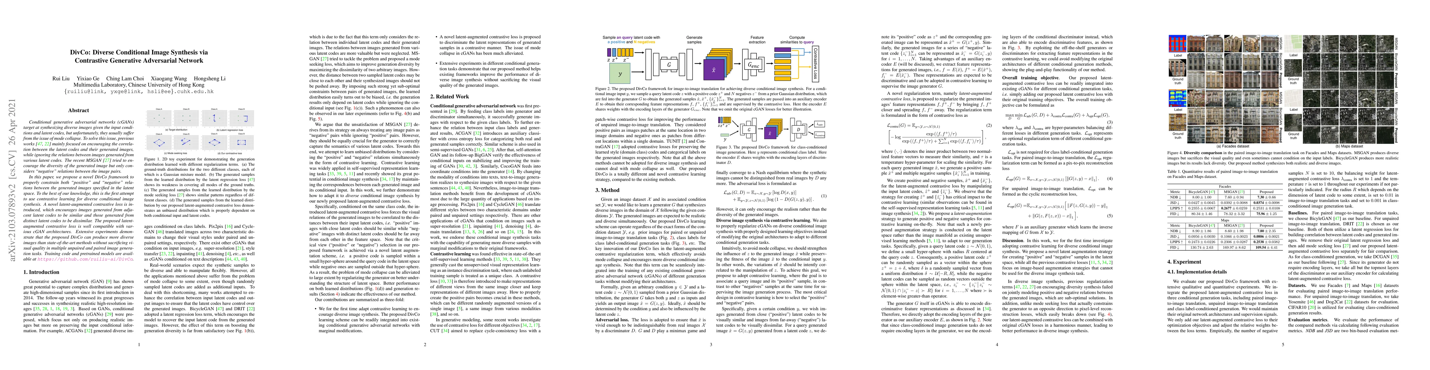 The paper introduces DivCo, a novel framework for diverse conditional image synthesis using contrastive learning to address mode collapse in cGANs. It employs a latent-augmented contrastive loss that encourages both positive and negative relations between generated images, leading to more diverse outputs without compromising visual quality.