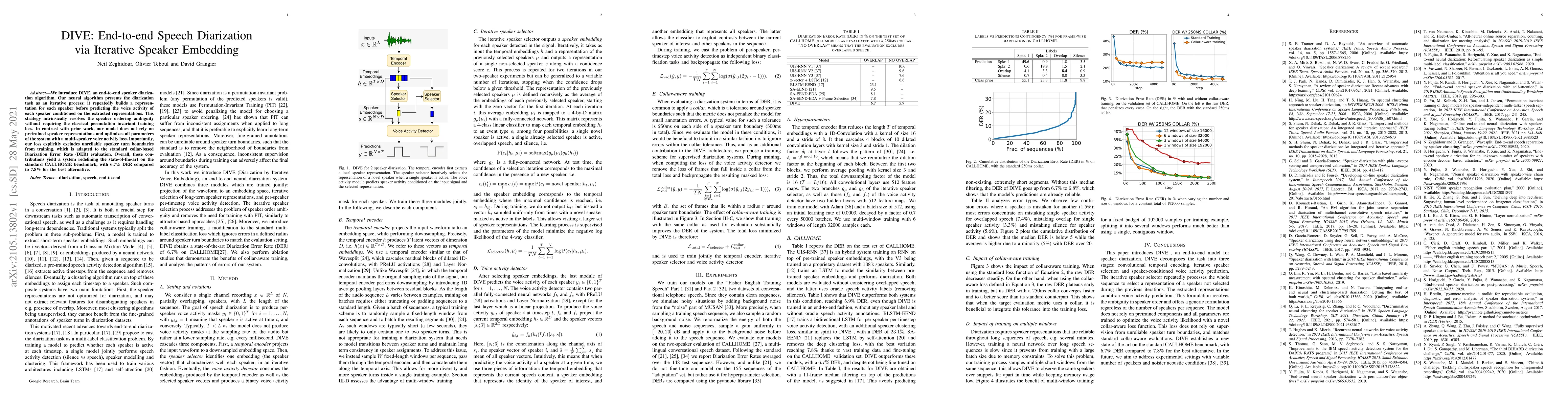 We introduce DIVE, an end-to-end speaker diarization algorithm. Our neural algorithm presents the diarization task as an iterative process: it repeatedly builds a representation for each speaker before predicting the voice activity of each speaker conditioned on the extracted representations. This strategy intrinsically resolves the speaker ordering ambiguity without requiring the classical permutation invariant training loss. In contrast with prior work, our model does not rely on pretrained speaker representations and optimizes all parameters of the system with a multi-speaker voice activity loss. Importantly, our loss explicitly excludes unreliable speaker turn boundaries from training, which is adapted to the standard collar-based Diarization Error Rate (DER) evaluation. Overall, these contributions yield a system redefining the state-of-the-art on the standard CALLHOME benchmark, with 6.7% DER compared to 7.8% for the best alternative.