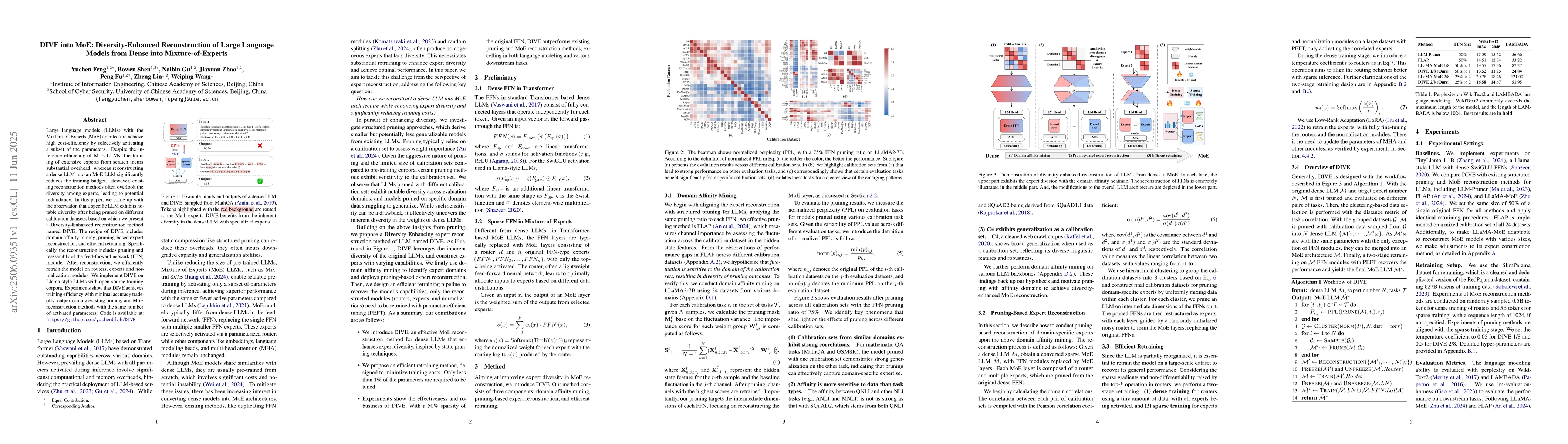 This paper introduces DIVE, a method to reconstruct large language models into mixture-of-experts using domain affinity mining and pruning-based expert reconstruction, achieving high training efficiency with minimal accuracy trade-offs.