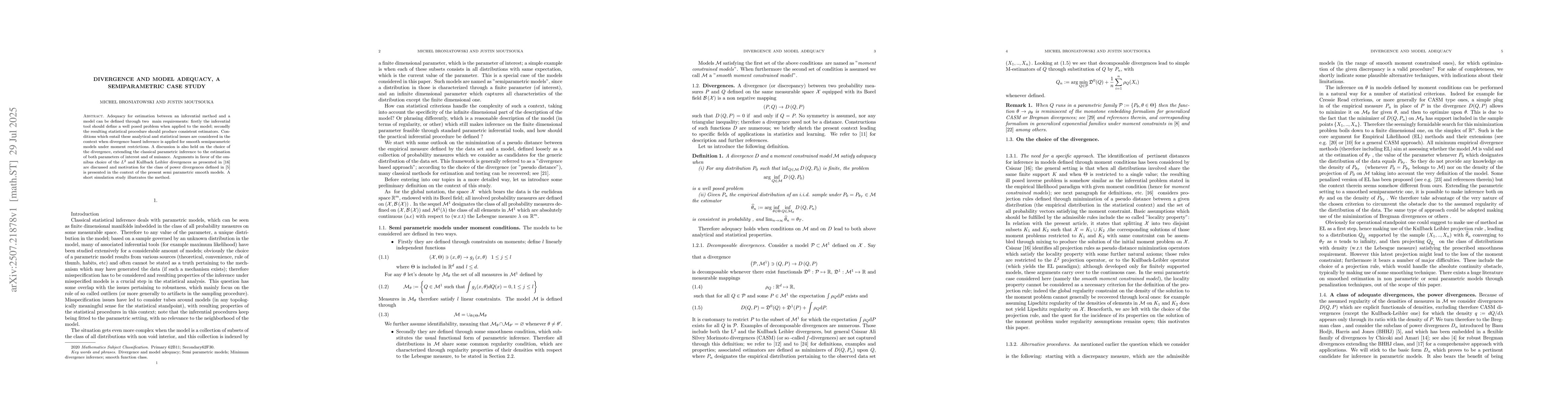 Adequacy for estimation between an inferential method and a model can be de{\ldots}ned through two main requirements: {\ldots}rstly the inferential tool should de{\ldots}ne a well posed problem when applied to the model; secondly the resulting statistical procedure should produce consistent estimators. Conditions which entail these analytical and statistical issues are considered in the context when divergence based inference is applied for smooth semiparametric models under moment restrictions. A discussion is also held on the choice of the divergence, extending the classical parametric inference to the estimation of both parameters of interest and of nuisance. Arguments in favor of the omnibus choice of the L 2 and Kullback Leibler choices as presented in [16] are discussed and motivation for the class of power divergences de{\ldots}ned in [5] is presented in the context of the present semi parametric smooth models. A short simulation study illustrates the method.