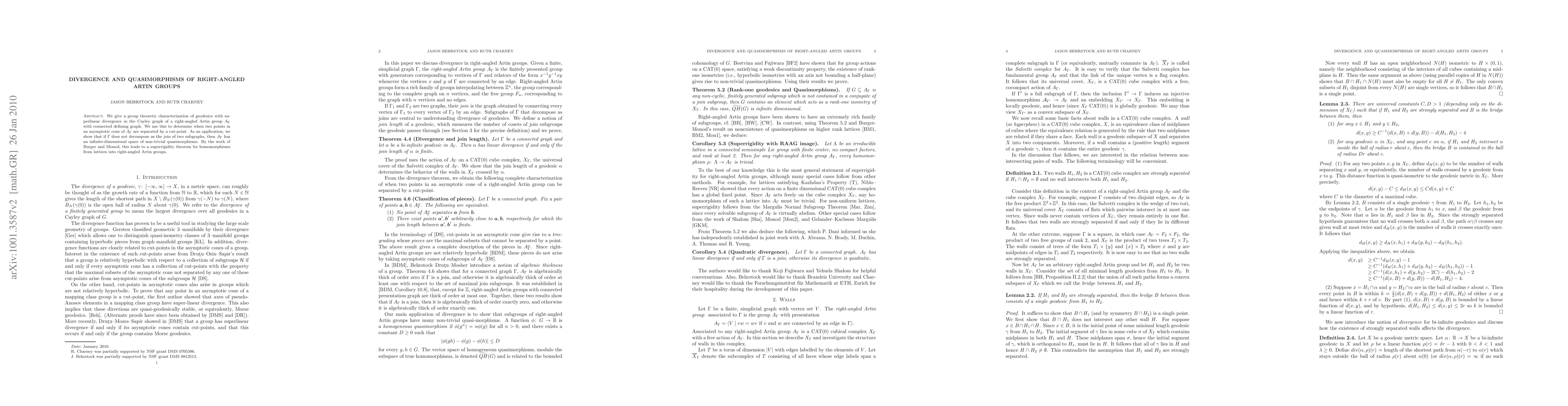 We give a group theoretic characterization of geodesics with superlinear divergence in the Cayley graph of a right-angled Artin group A(G) with connected defining graph G. We use this to determine when two points in an asymptotic cone of A(G) are separated by a cut-point. As an application, we show that if G does not decompose as the join of two subgraphs, then A(G) has an infinite-dimensional space of non-trivial quasimorphisms. By the work of Burger and Monod, this leads to a superrigidity theorem for homomorphisms from lattices into right-angled Artin groups.