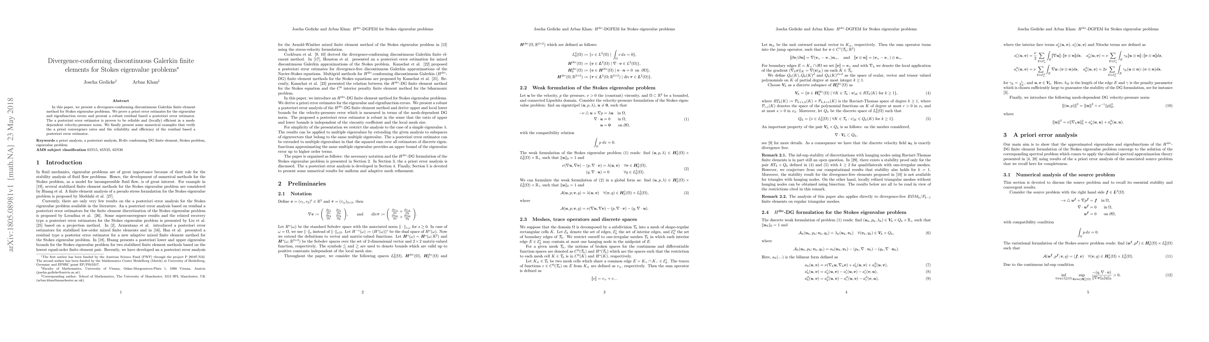 This paper introduces a divergence-conforming discontinuous Galerkin finite element method for solving Stokes eigenvalue problems, providing a priori error estimates and a robust residual-based a posteriori error estimator that is both reliable and efficient. Numerical examples validate the theoretical convergence rates and the error estimator's performance.