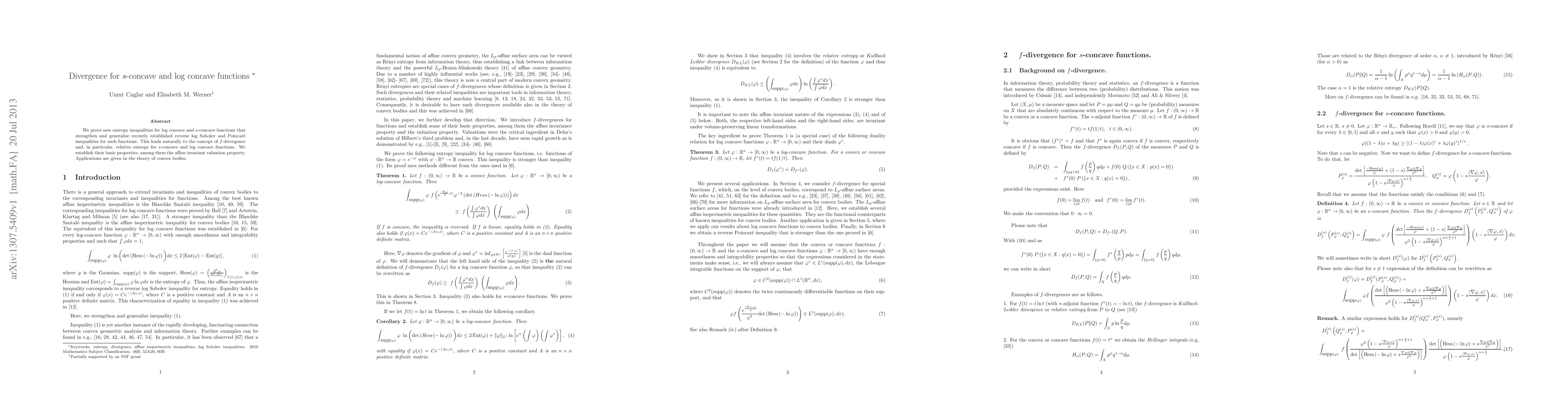 This paper proves new entropy inequalities for log concave and s-concave functions, strengthening recent reverse log Sobolev and Poincaré inequalities. It introduces f-divergence and relative entropy for these functions, establishing their properties, including an affine invariant valuation, and applies these concepts in the theory of convex bodies.