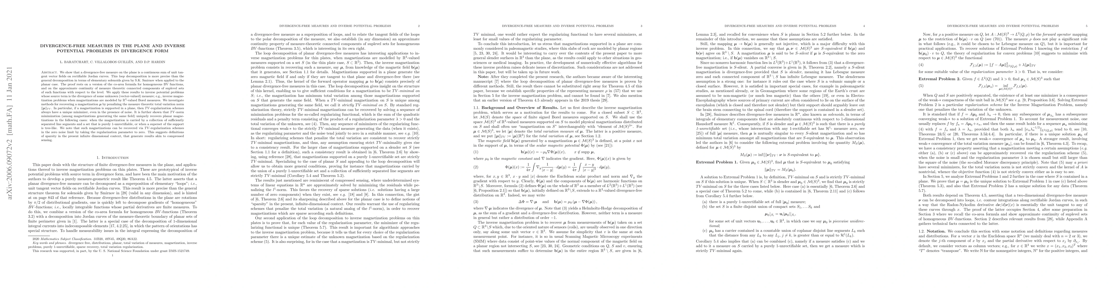 We show that a divergence-free measure on the plane is a continuous sum of unit tangent vector fields on rectifiable Jordan curves. This loop decomposition is more precise than the general decomposition in elementary solenoids given by S.K. Smirnov, when applied to the planar case. The proof involves extending the Fleming-Rishel formula to homogeneous BV functions (in any dimension), and establishing for such functions approximate continuity of measure theoretic connected components of suplevel sets as functions of the level. We apply these results to inverse potential problems whose source term is the divergence of some unknown (vector-valued) measure. A prototypical case is that of inverse magnetization problems when magnetizations are modeled by R3-valued Borel measures. We investigate methods for recovering a magnetization {\mu} by penalizing its measure theoretic total variation norm (TV). In particular, we prove that if a magnetization is supported in a plane, then TV-regularization schemes always have a unique minimizer, even in the presence of noise. It is further shown thatTV-norm minimization (among magnetizations generating the same field) uniquely recovers planar magnetizations in the following cases: when the magnetization is carried by a collection of sufficiently separated line segments and a set that is purely 1-unrectifiable, or when a superset of the support is tree-like. We note that such magnetizations can be recovered via TV-regularization schemes in the zero noise limit, by taking the regularization parameter to zero. This suggests definitions of sparsity in the present infinite dimensional context, that generate results akin to compressed sensing