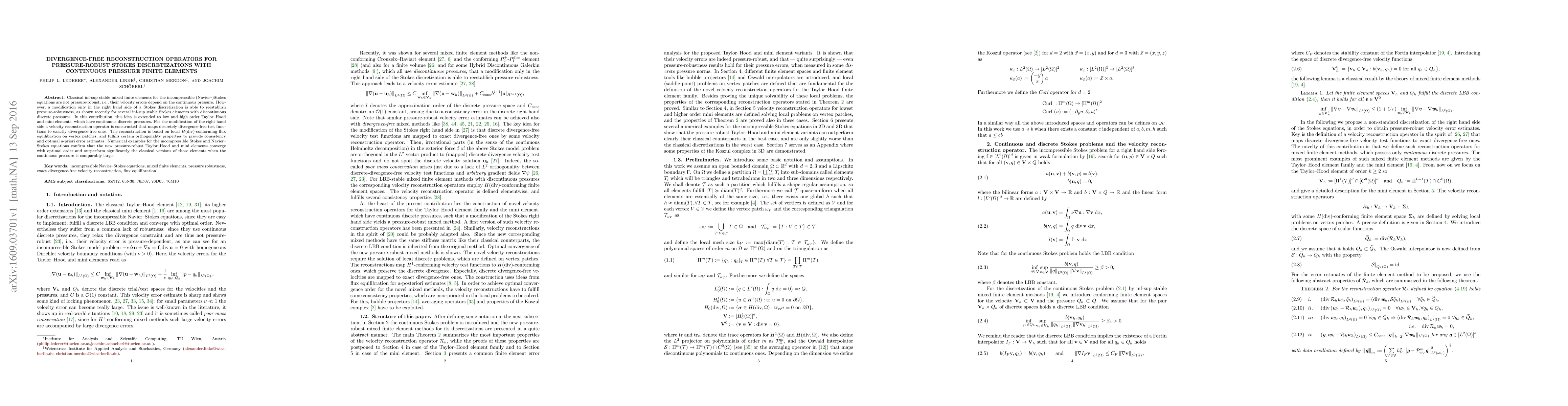 This paper proposes a modification to classical inf-sup stable mixed finite elements for the incompressible Stokes equations to achieve pressure-robustness, even with continuous pressure finite elements. The method uses a divergence-free reconstruction operator based on local $H(\mathrm{div})$-conforming flux equilibration, ensuring optimal convergence and superior performance under large continuous pressure conditions.