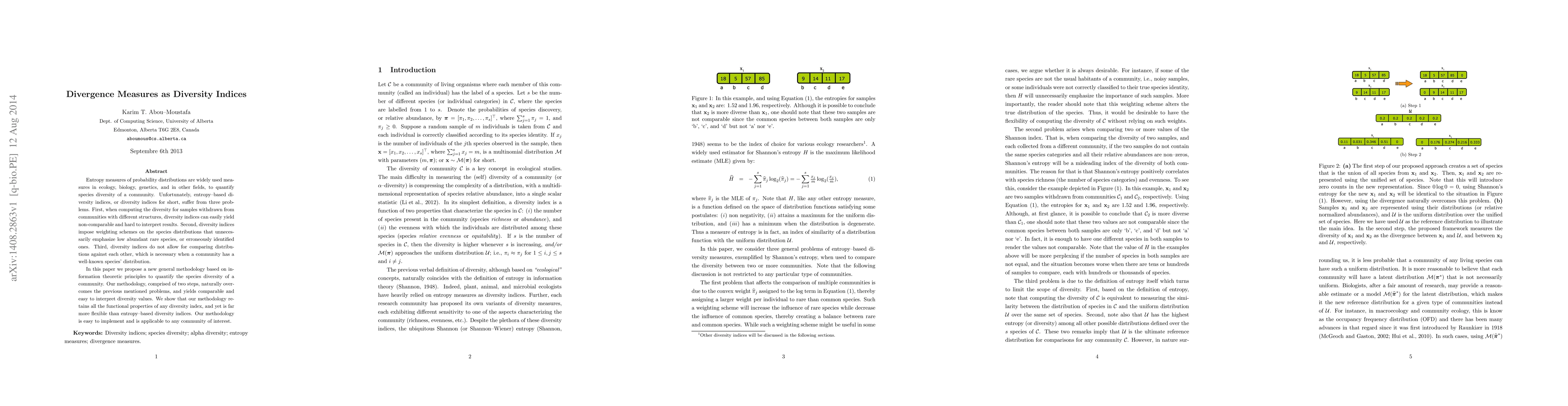 A new diversity index methodology uses information-theoretic principles to quantify species diversity in communities, overcoming issues with existing entropy-based measures, and provides comparable and easy-to-interpret results.