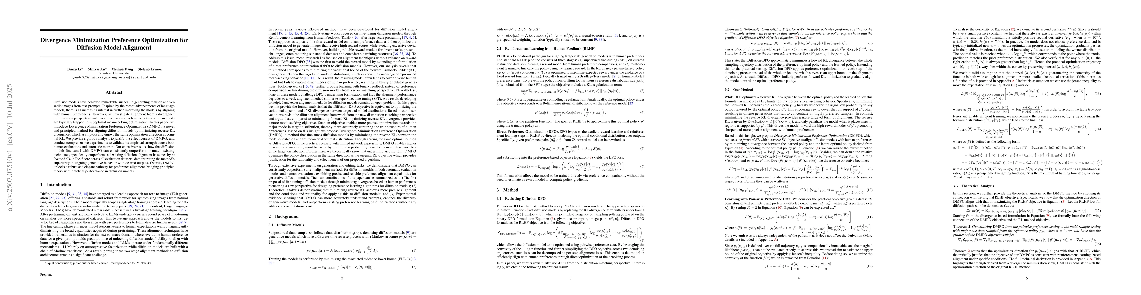 The paper introduces Divergence Minimization Preference Optimization (DMPO), a novel method for aligning diffusion models with human preferences. DMPO minimizes reverse KL divergence, improving alignment over existing techniques, which it shows outperforms by at least 64.6% in PickScore across various datasets.