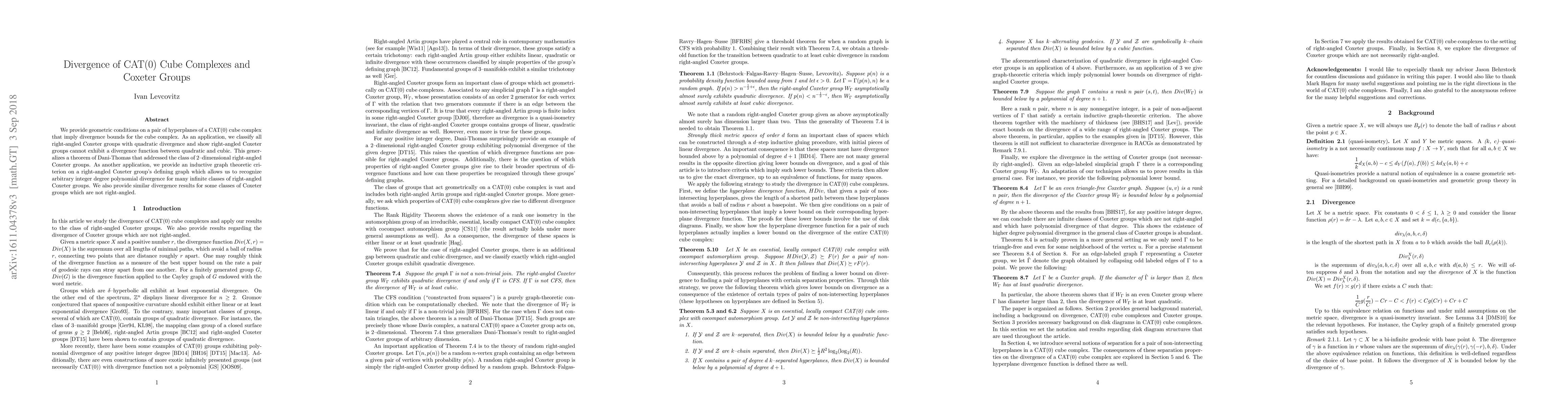 This paper establishes geometric conditions for divergence in CAT(0) cube complexes and classifies right-angled Coxeter groups with quadratic divergence, proving they cannot exhibit divergence between quadratic and cubic. It also introduces a graph-theoretic criterion for recognizing polynomial divergence in various right-angled Coxeter groups.